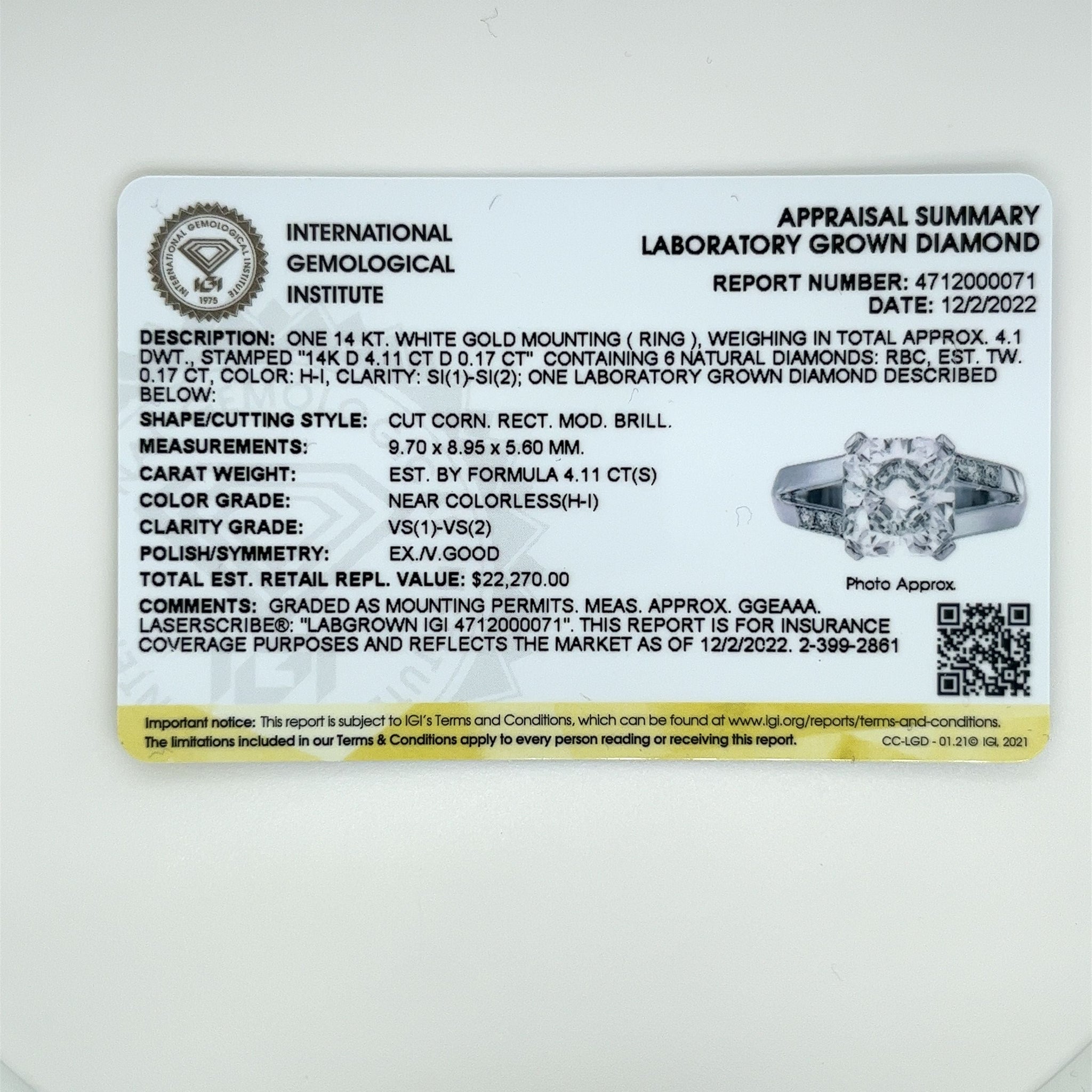 ألماسة مقطوعة بشكل مشع بوزن 4.11 قيراط مزروعة في المختبر ومعتمدة من IGI مثبتة في Ring رائع بحزام منقسم من الذهب الأبيض عيار 14 قيراط. يتميز إعداد Ring بحزام ألماسي شبه مثبت مذهل، مما يخلق تأثير "المرآة" على الملف الشخصي.