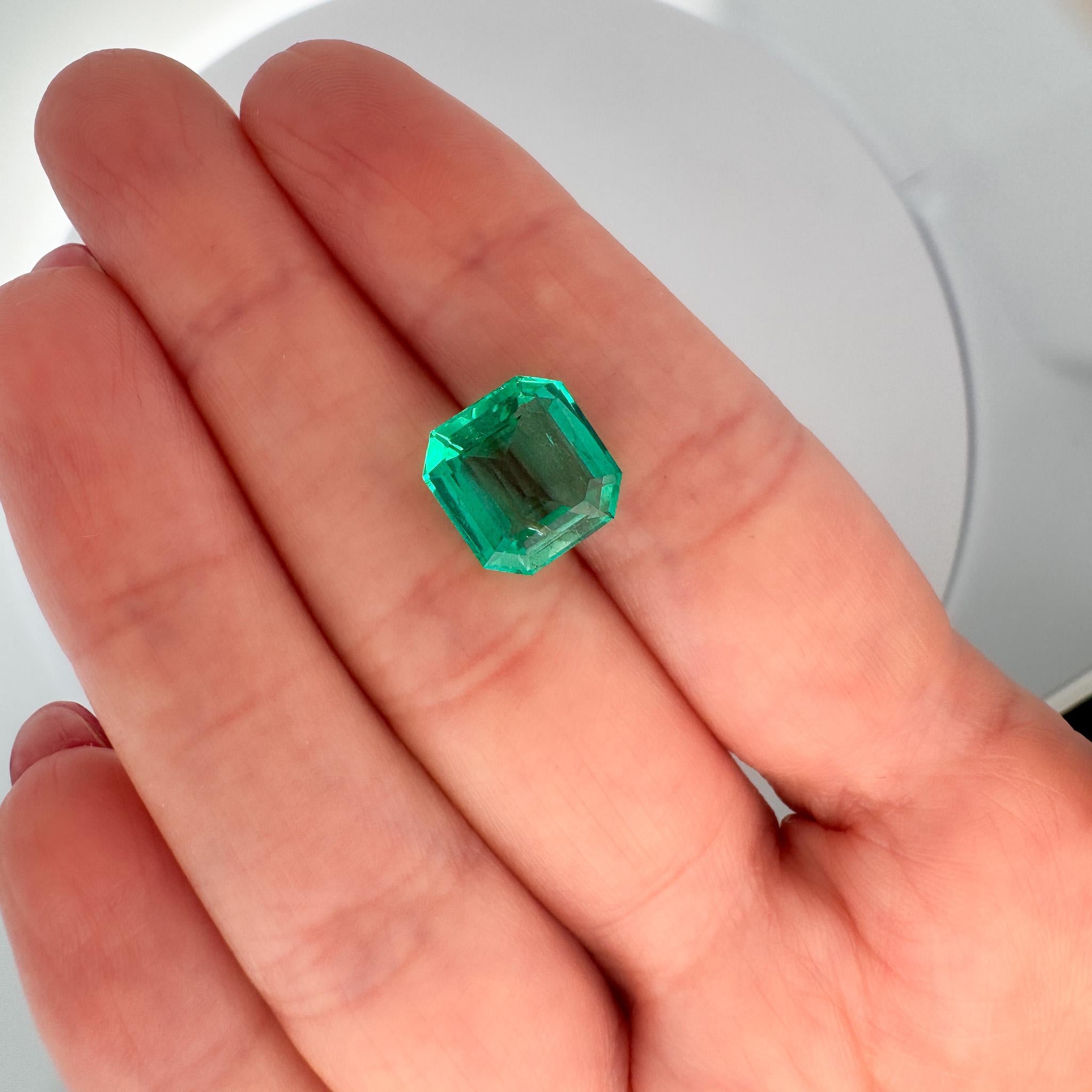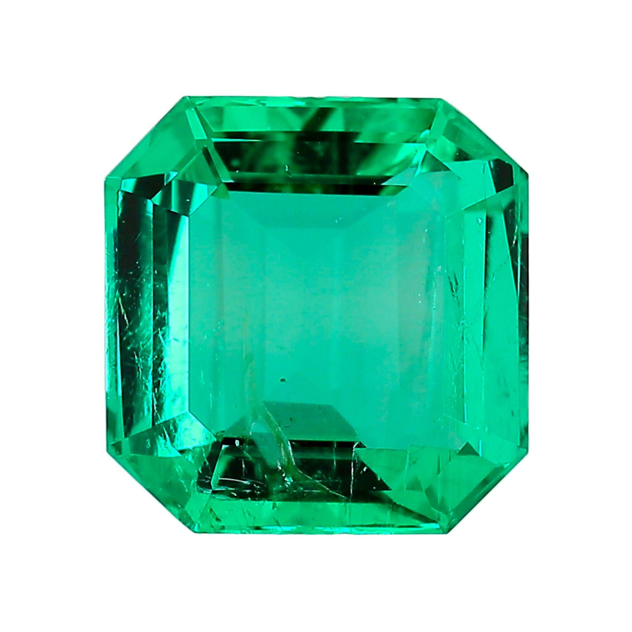 This 4.45 carat Colombian emerald displays rich transparent green color characteristic of the world's finest emerald deposits. The square emerald cut features step faceting with parallel rows that showcase the emerald's color depth and transparency, while the nearly equal length and width create balanced proportions ideal for statement jewelry. Measuring over 10.5mm square, this emerald provides substantial presence appropriate for rings, pendants, or brooches.