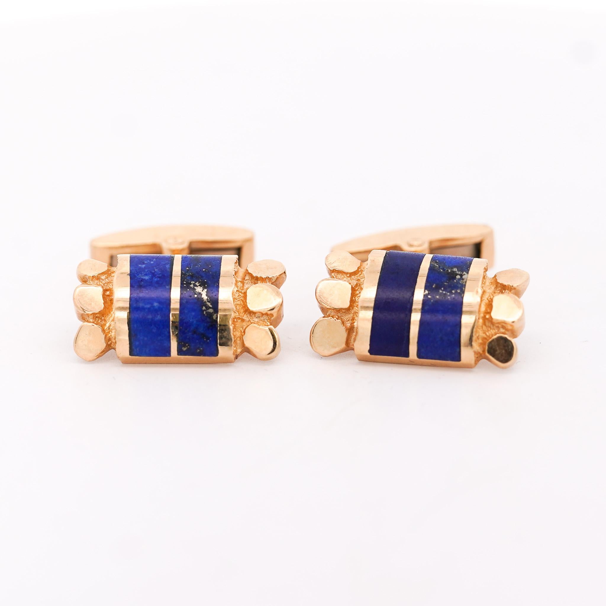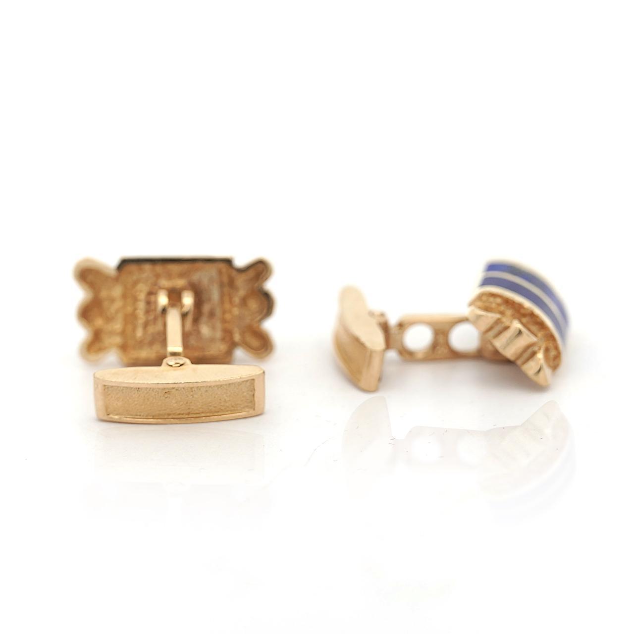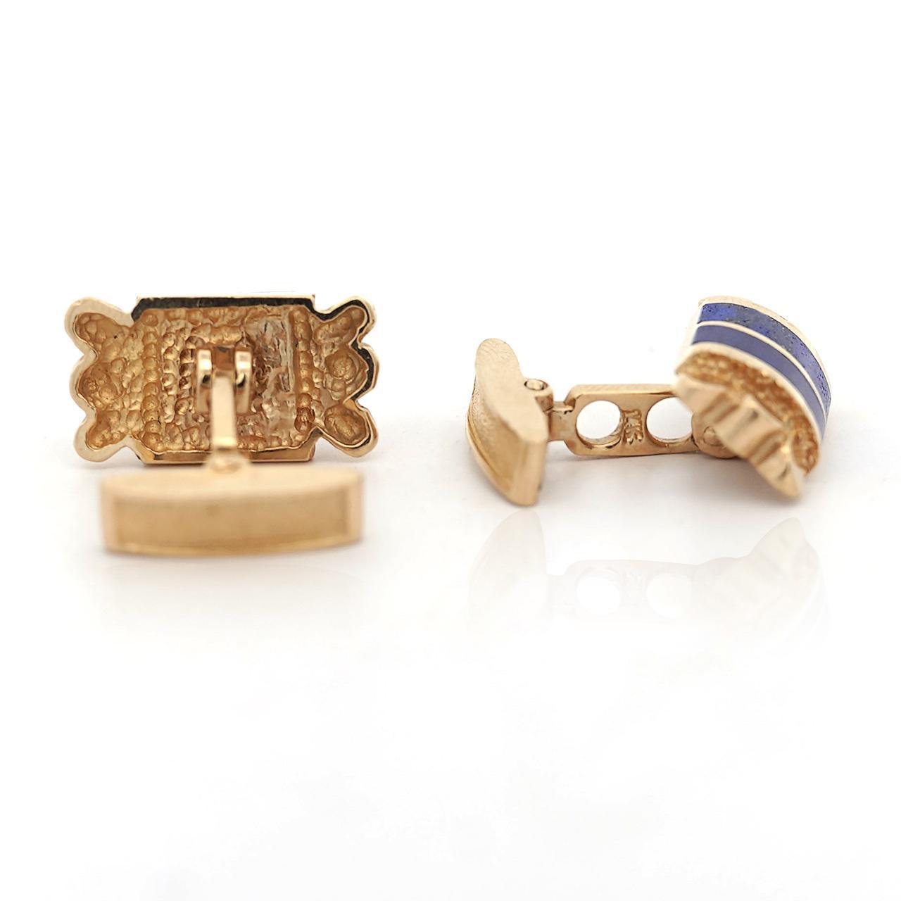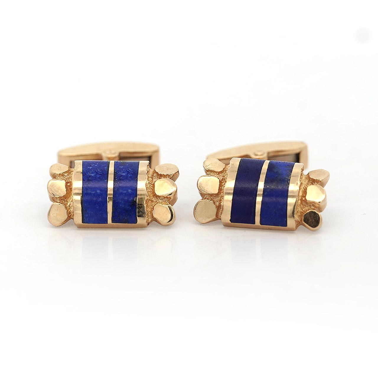 Lapis lazuli has been prized for millennia as a symbol of royalty and honor, with its deep blue color containing golden pyrite flecks resembling stars in night sky. During the 1960s retro period, cufflinks featuring hardstone inlays and textured gold work represented masculine elegance suitable for formal business and evening wear. At 12.42 grams in solid 14K yellow gold with substantial lapis inlay, these cufflinks deliver investment-grade materials and vintage craftsmanship.