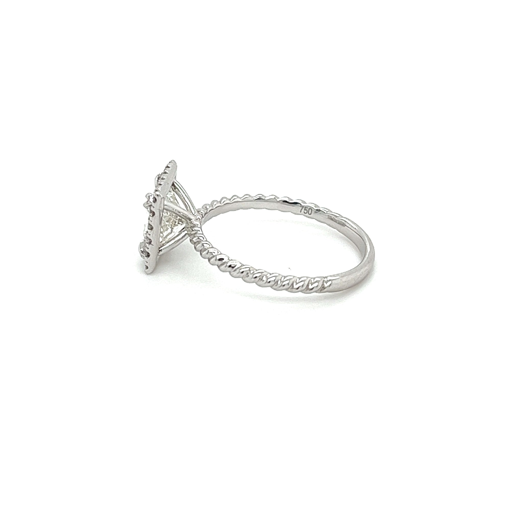 1.60 carat princess cut lab-grown diamond engagement ring with a round cut square-shaped diamond halo. Set in 18k white gold, this captivating engagement ring showcases an artful rope chain design shank, gracefully curved to provide a fascinating contrast to the sharp, symmetrical princess-cut center stone. With its sophisticated allure and exceptional craftsmanship, this ring is an unforgettable symbol of love and commitment, poised to captivate hearts for generations.