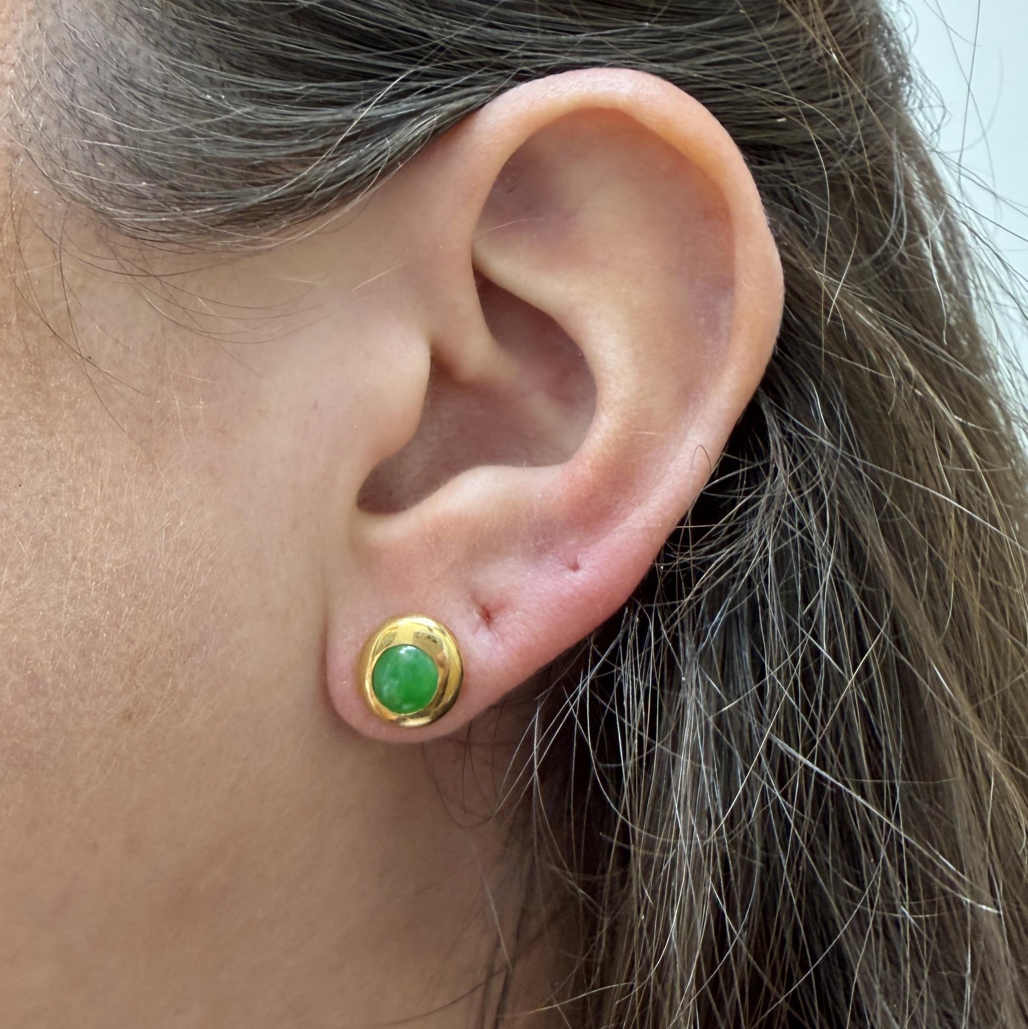 Jadeite Jade (Type A) stud earrings featuring oval cabochon stones in 18K yellow gold bezel settings. Natural green jade measuring 10.7 x 9.4mm with push back closure, weighing 5.19 grams per pair.