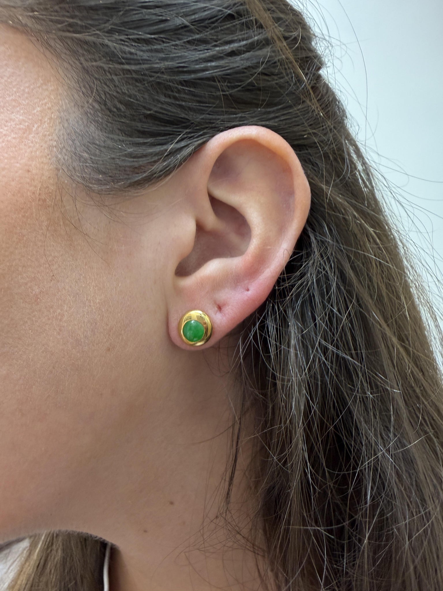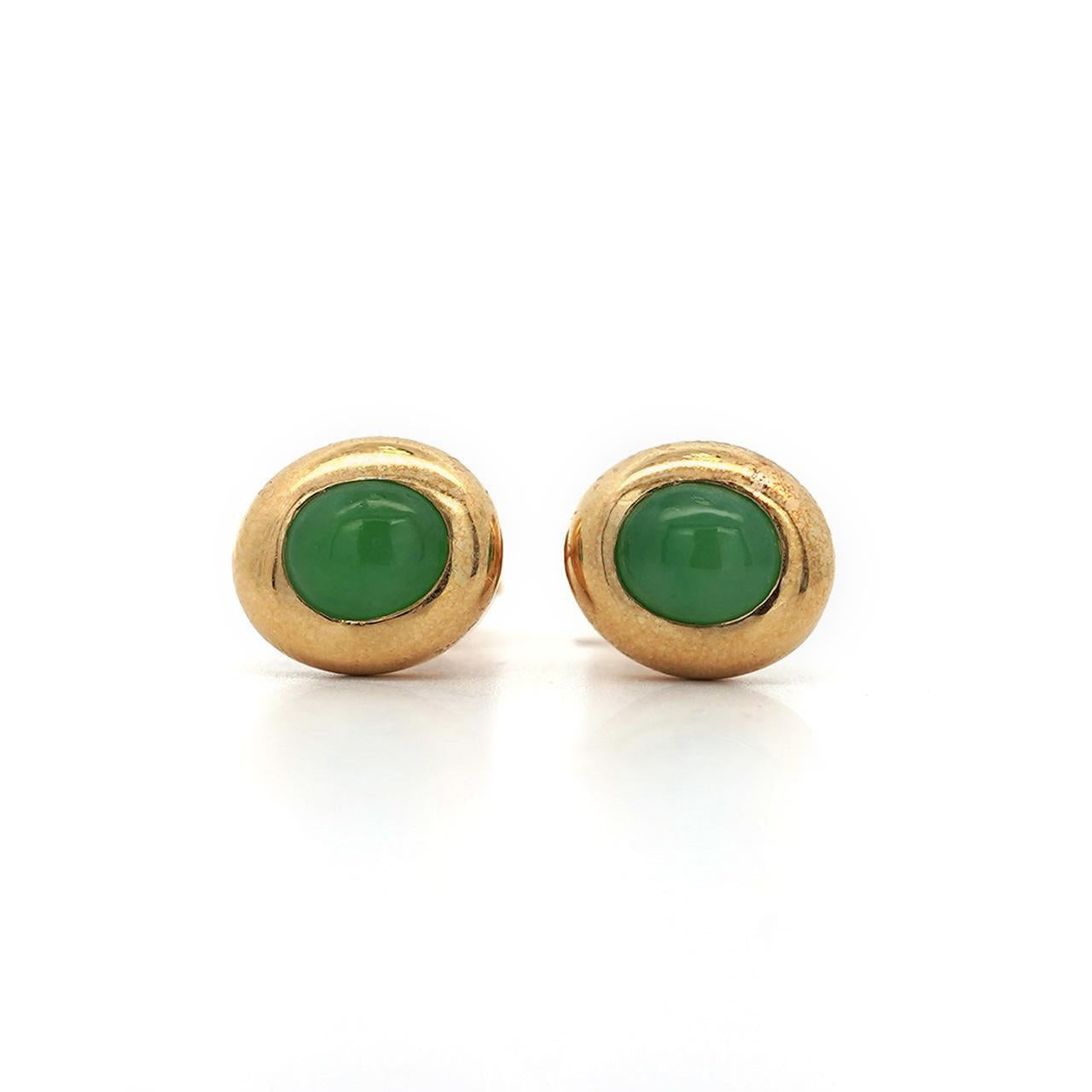 Each stud features oval cabochon jadeite jade set in smooth 18K yellow gold bezel setting that completely surrounds the stone's perimeter. The polished jade displays translucent green color with subtle variation creating depth within the cabochon form. The bezel setting features high-polish finish on the gold frame creating clean lines and secure stone retention. Standard push back posts provide comfortable wear with secure closure. The substantial 5.19 gram weight indicates solid gold construction throughout.