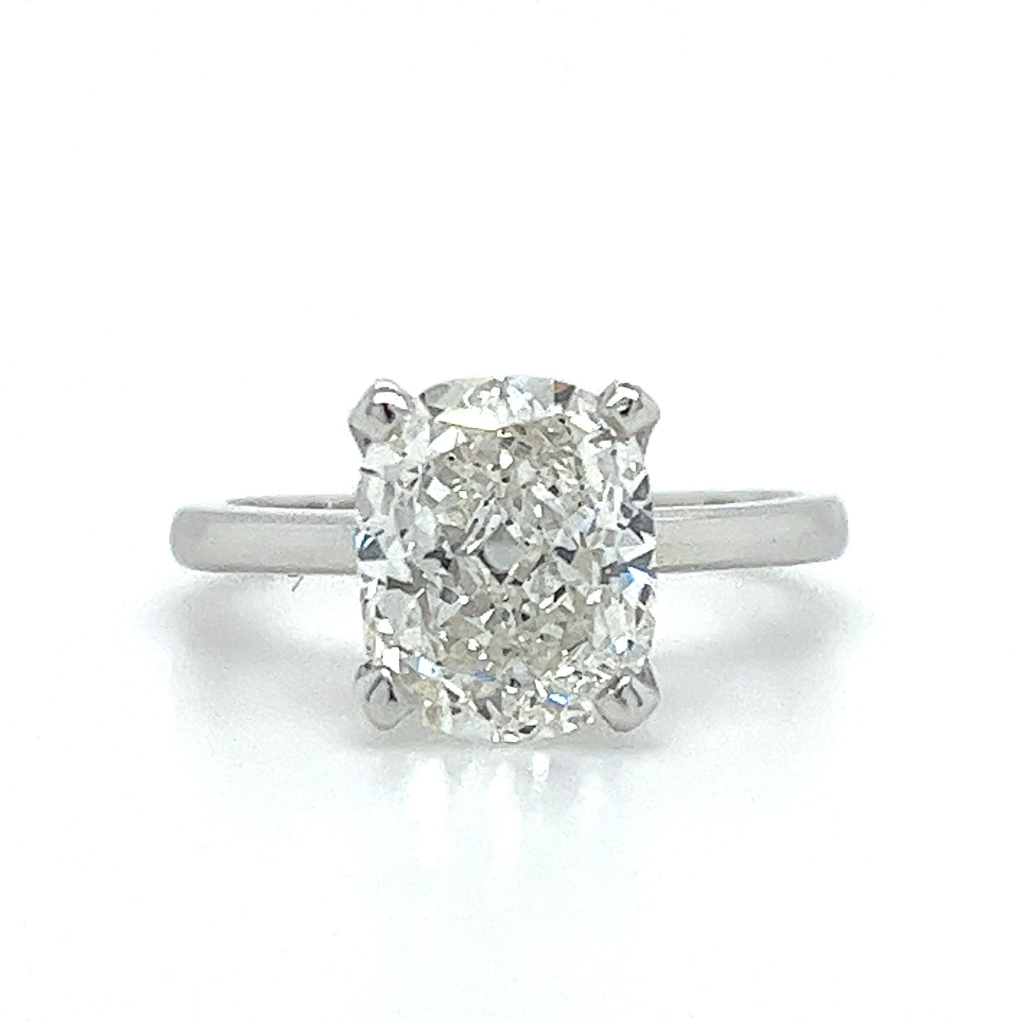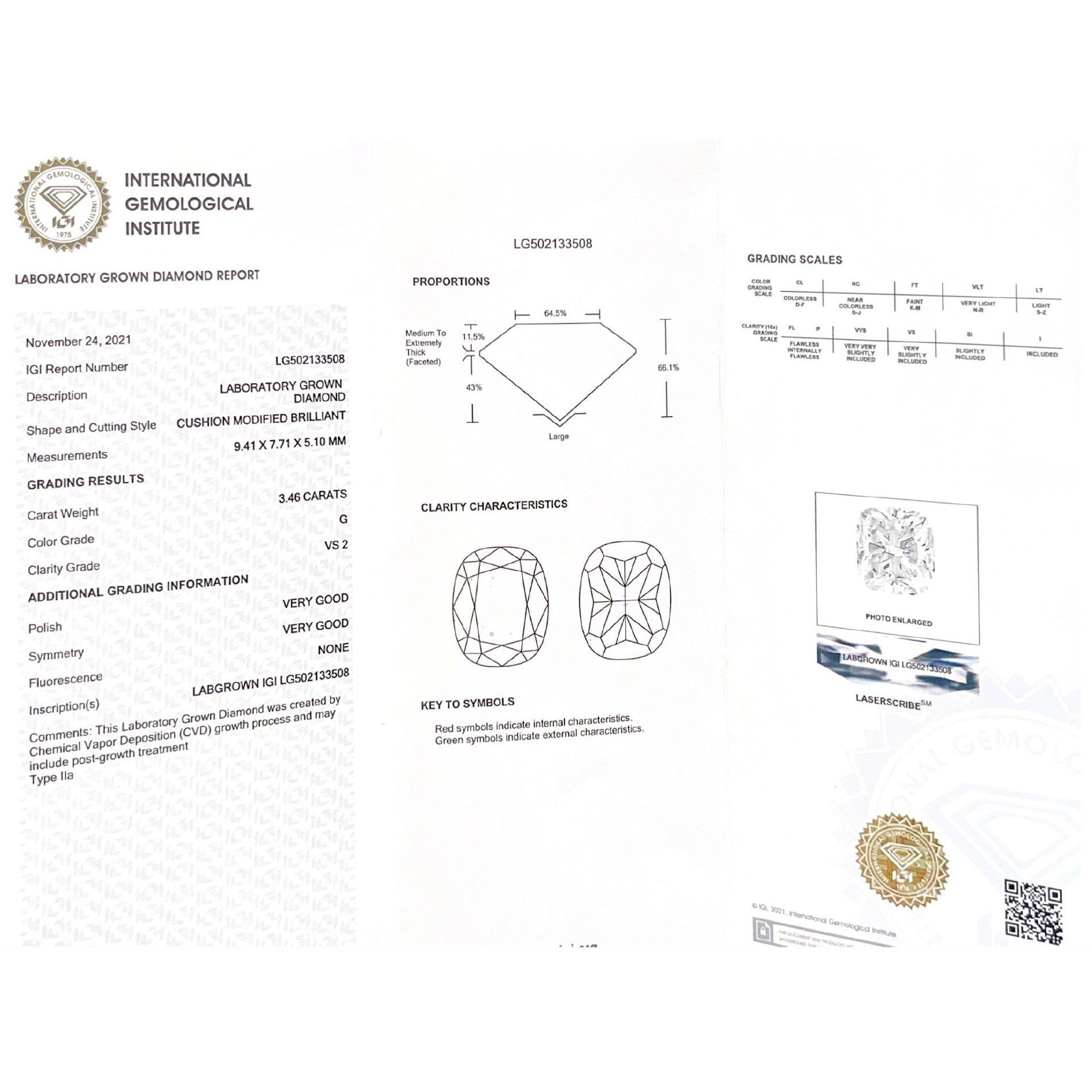 3,46 Karat Weißgold Cushion Cut Labordiamant Verlobungsring. Cushion Cut, G-Farbe, VS2-Reinheit. Im Labor gezüchteter Diamant-Verlobungsring, montiert in einer 18k Weißgold-Solitäreinstellung. Dieser Cushion Cut hat einen einzigartigen verlängerten Schliff, der ihn leicht wie einen ovalen Schliff erscheinen lässt. Geschnitten wie ein Cushion, geformt mehr wie ein Oval.