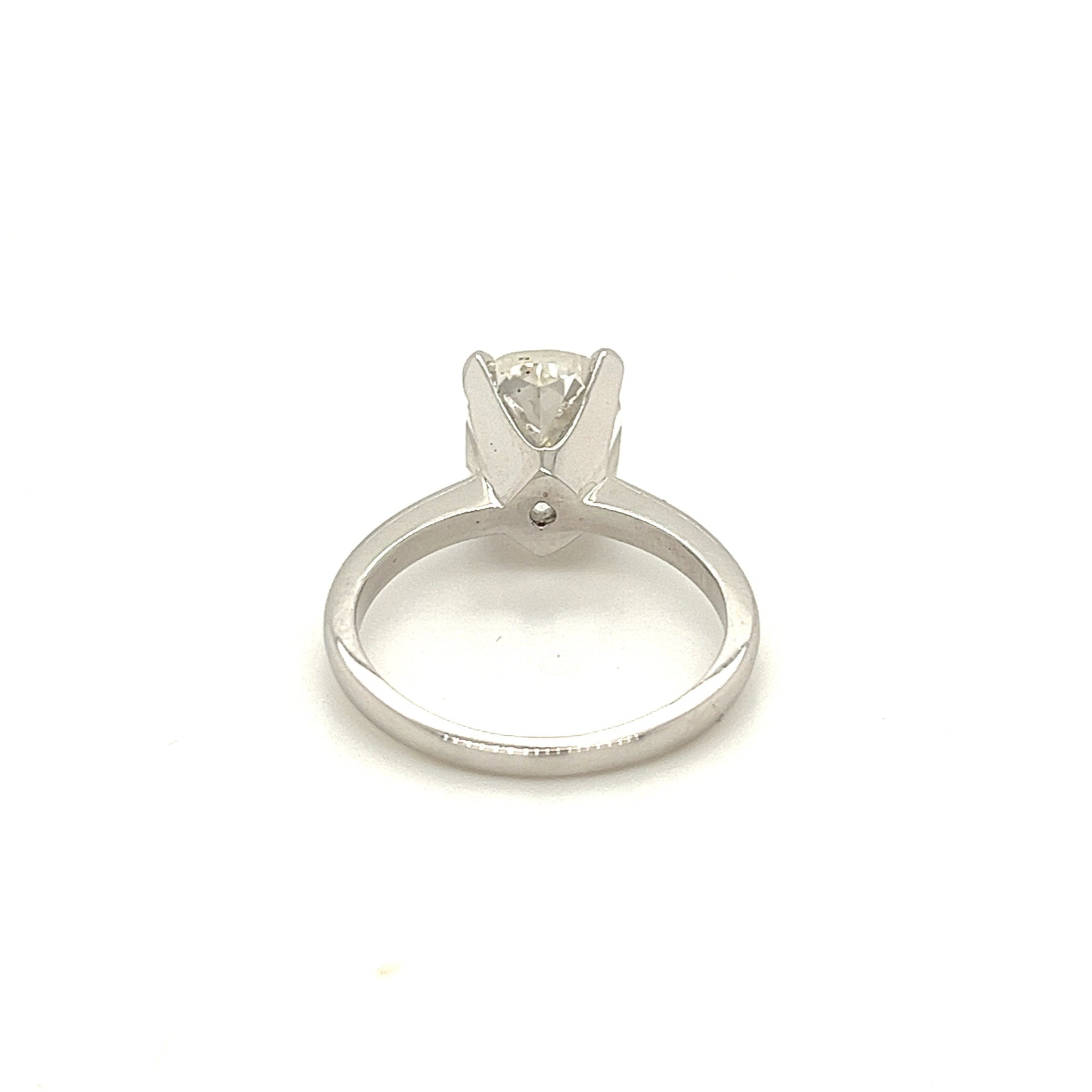 Ein einfacher 18k Weißgold-Ring mit geradem Schaft und erhöhter 4-Krappen-Fassung. Die erhöhte Fassung übertreibt die Größe und verleiht dem Zentrumstein die Optik eines größeren Steins, und obwohl er bereits eine beträchtliche Größe von 3,46 Karat hat, verleiht diese Fassung das gewisse Extra.