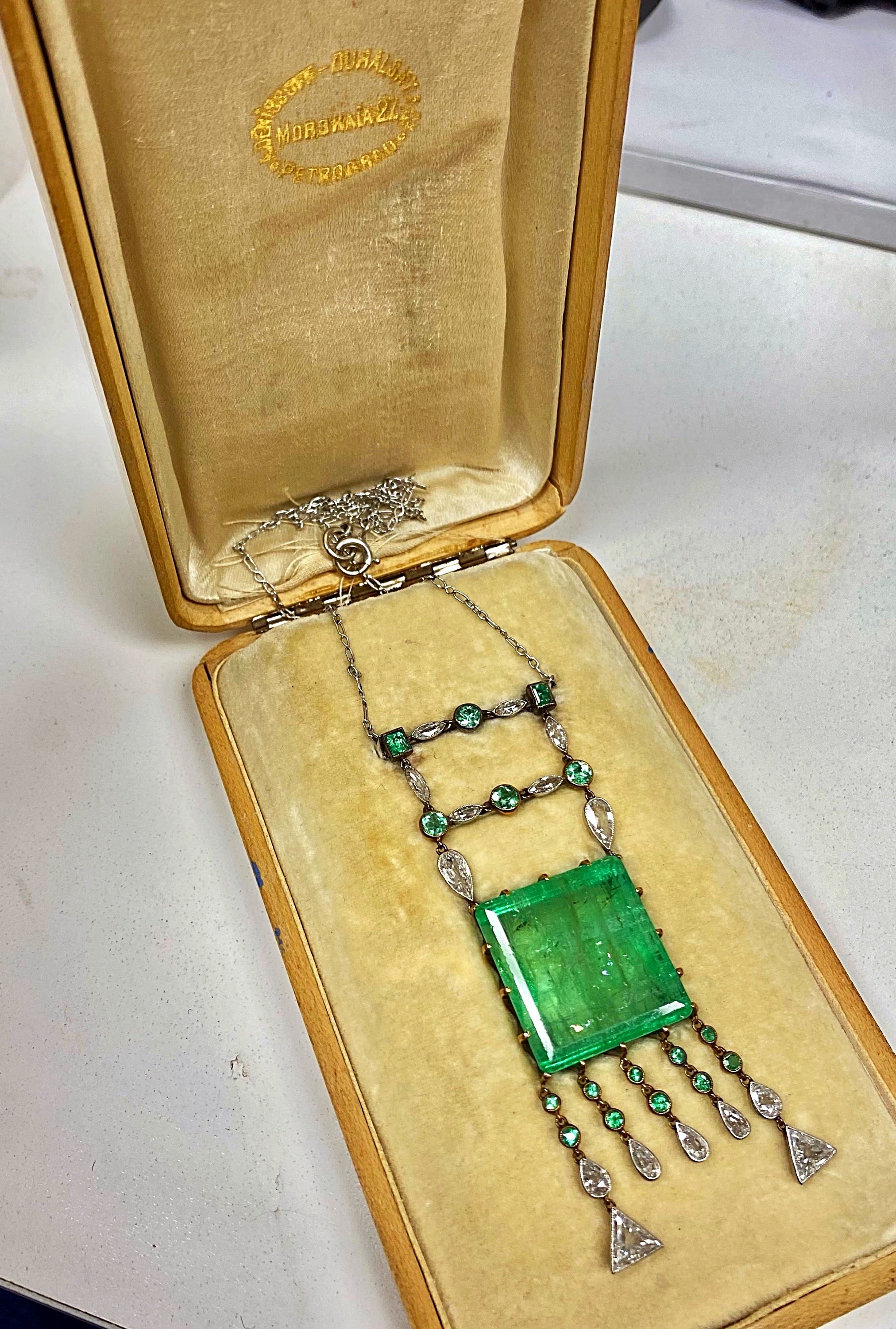 This historic pendant necklace, centered by an exceptionally large Ural emerald exceeding 40 carats, is attributed to Russian artist, lapidary, and designer Alexey Denisov-Uralsky (1864–1926). Created during the final years of the Russian Empire, the necklace represents one of the most complete and thoroughly documented surviving examples of Denisov-Uralsky’s rare jewelry production.