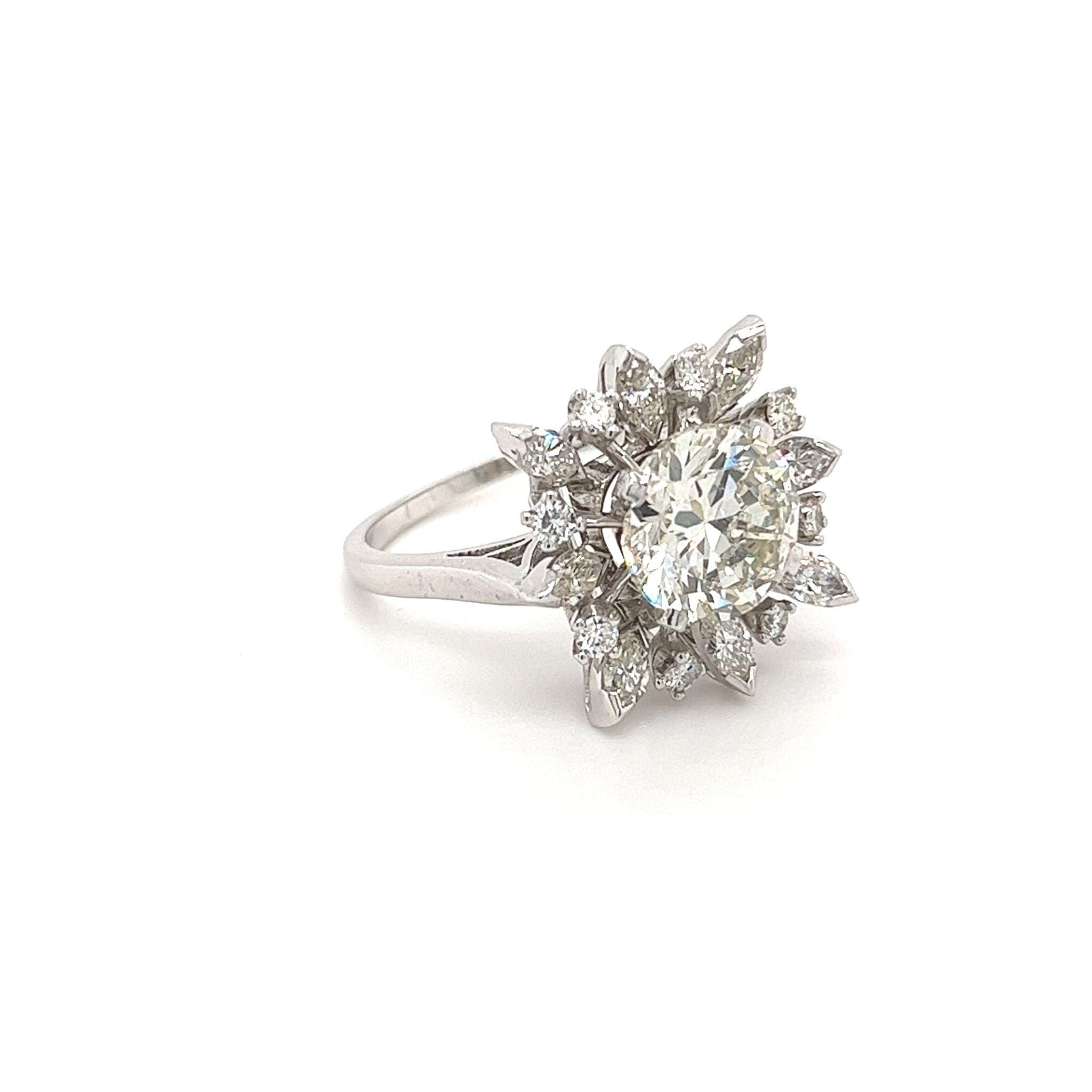 Der Diamant-Halo zeigt natürliche Marquise- und Rundschliff-Diamonds Seite an Seite in faszinierender Symmetrie und Anmut. Dieser Ring ist alles andere als der typische Standard-Diamant-Verlobungsring.