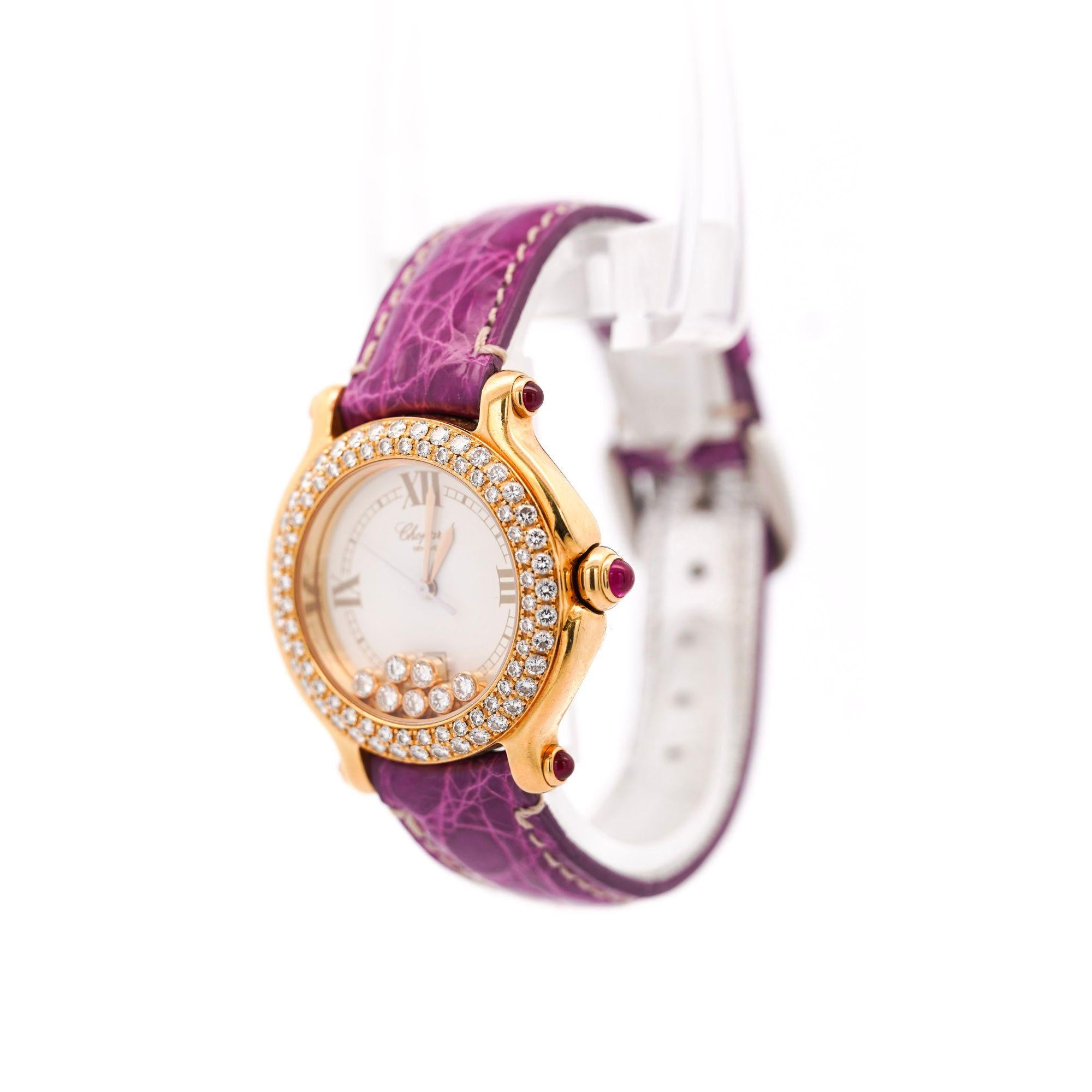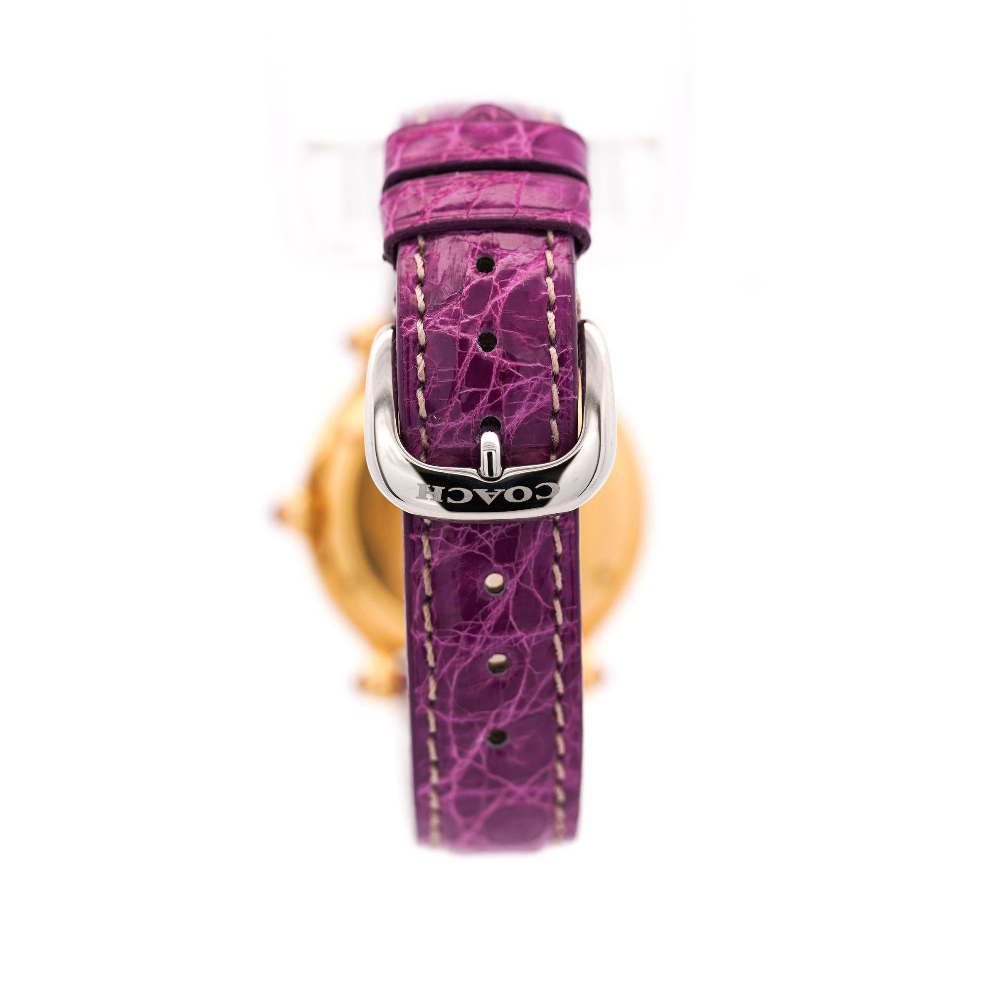 Design & Construction The 32mm round case features 18K yellow gold construction with full diamond pavé bezel surrounding the white dial. The ruby crystal crowns the winding stem while ruby cabochons accent the integrated lugs, providing vibrant red color contrast against the yellow gold. Chopard's signature floating diamonds move freely within the dial chamber, creating dynamic sparkle with wrist motion. The white dial displays gold Roman numeral hour markers with matching gold hands. Purple crocodile-embossed leather strap signed "Coach" features contrast stitching and connects through integrated lugs with ruby accents.