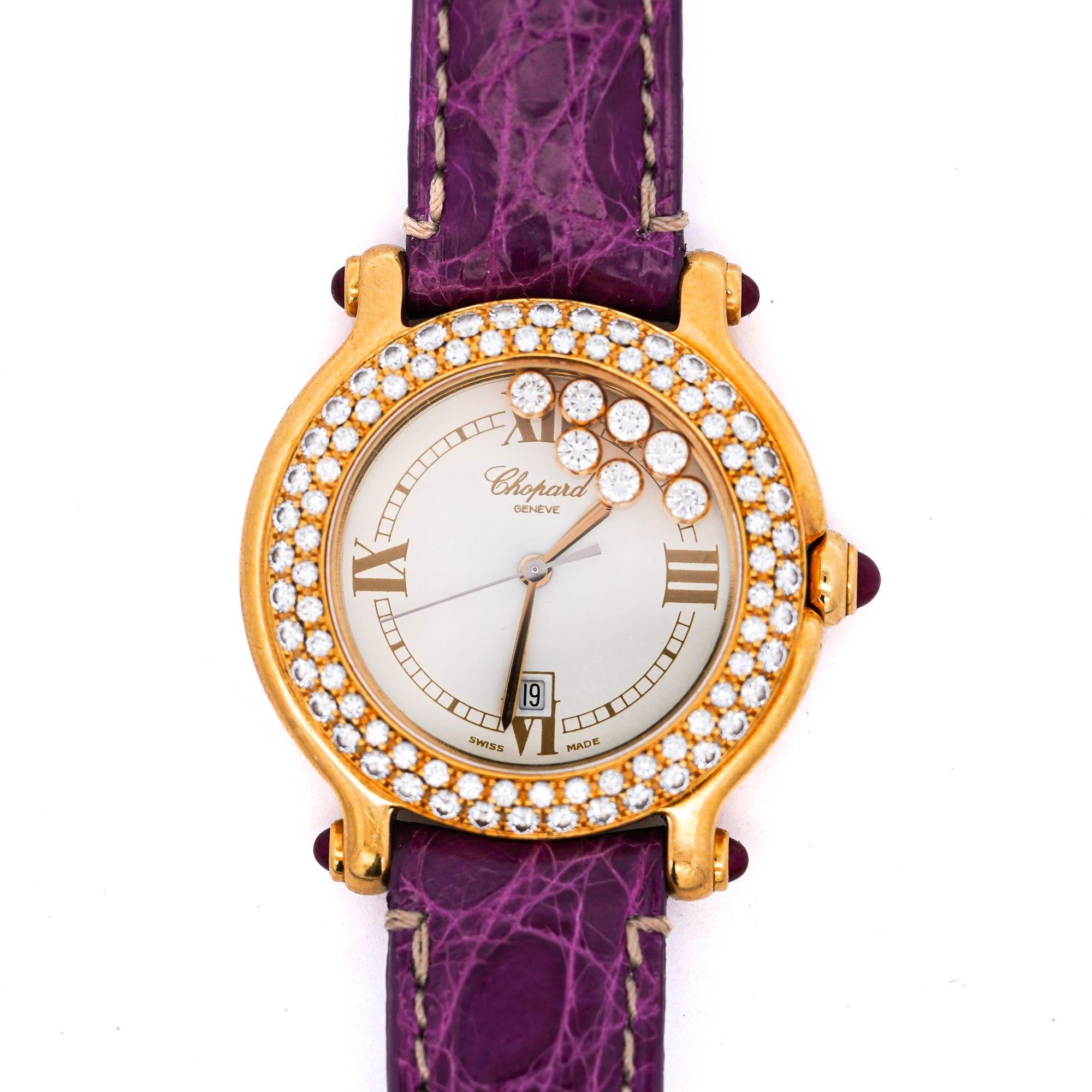 Chopard Happy Sport featuring white dial with floating diamonds in 18K yellow gold 32mm case with diamond-set bezel and ruby crystal and lugs. Quartz movement on purple leather strap signed Coach, weighing 56 grams, fits 7.5-inch wrist, includes original Chopard box.