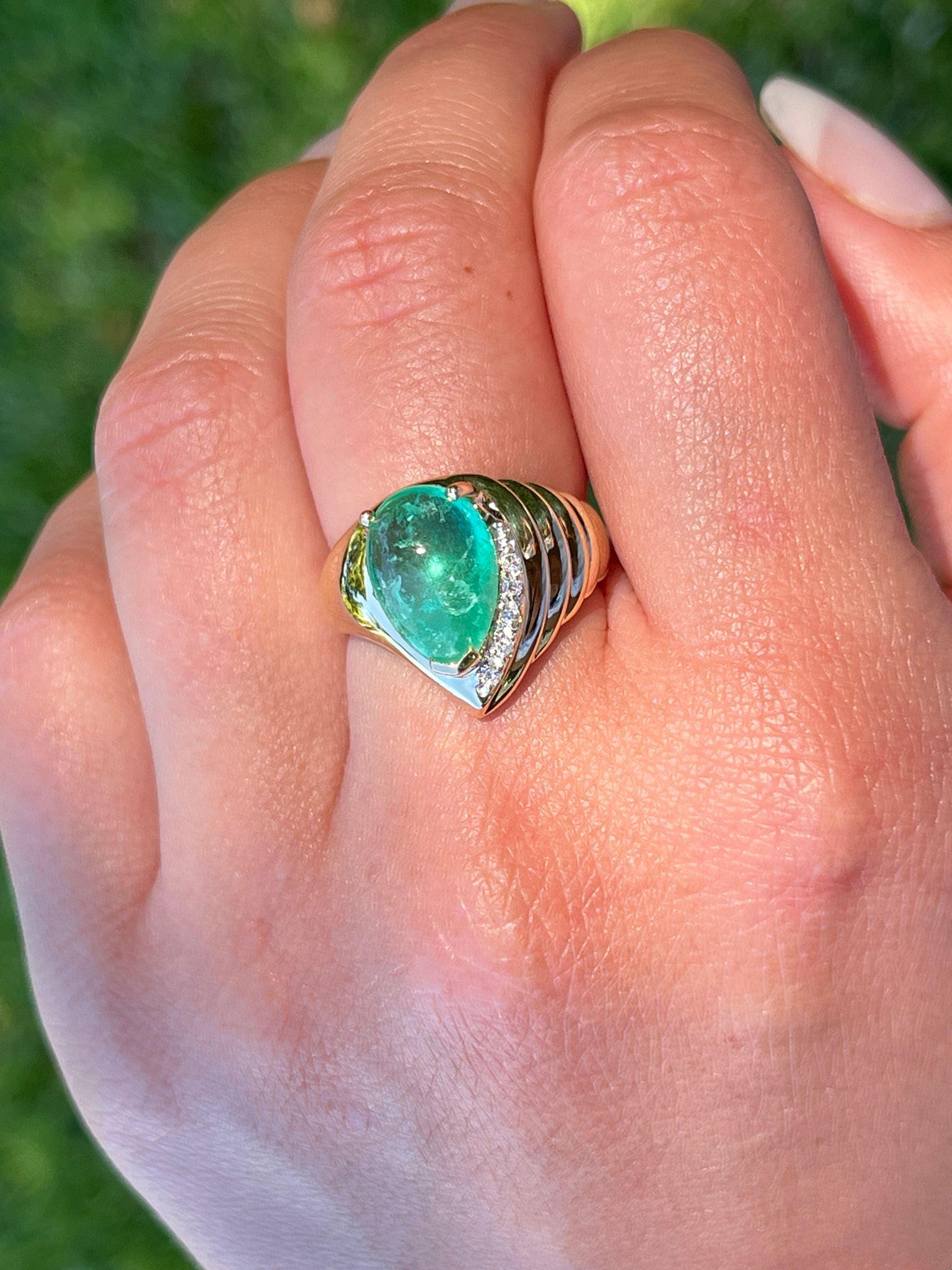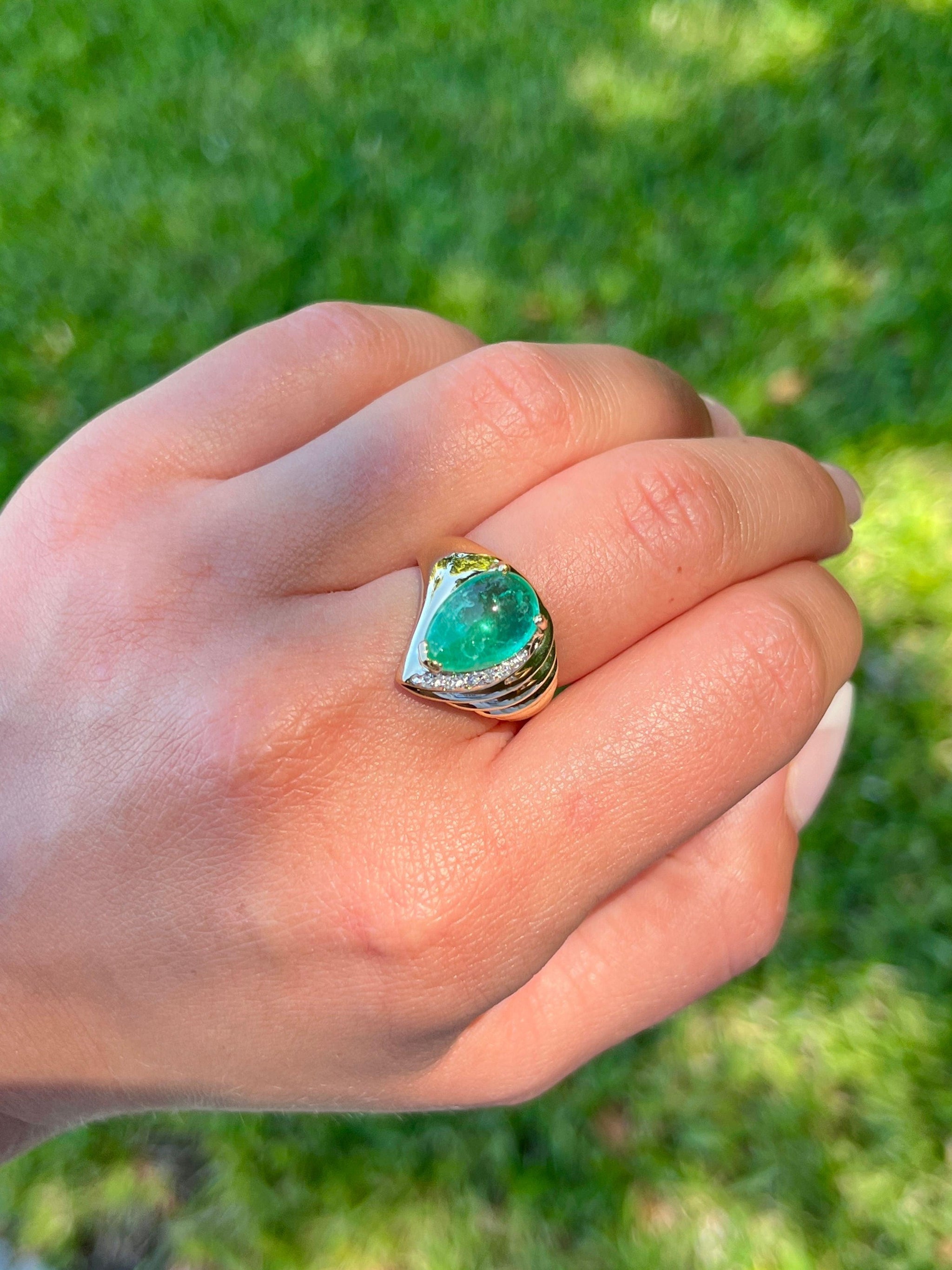 This ring features an impressive 7.81 carat natural emerald cut as a pear-shaped cabochon, showcasing the smooth, domed surface characteristic of cabochon cutting that emphasizes color depth and natural beauty over faceted brilliance. The substantial carat weight combined with the elongated pear outline creates dramatic finger presence that flatters the hand. Emerald, the green variety of beryl, ranks 7.5-8 on the Mohs hardness scale and displays the rich green color prized for millennia. The cabochon cut is particularly suited to emeralds with visible inclusions or exceptional color saturation, as the smooth dome maximizes color while the lack of facets minimizes visibility of internal characteristics. The 0.29 carats of round brilliant diamonds provide complementary sparkle, their white brilliance creating beautiful contrast against both the vivid green emerald and warm yellow gold setting.