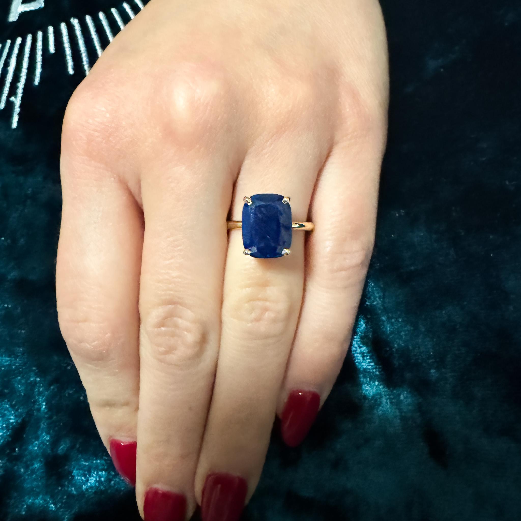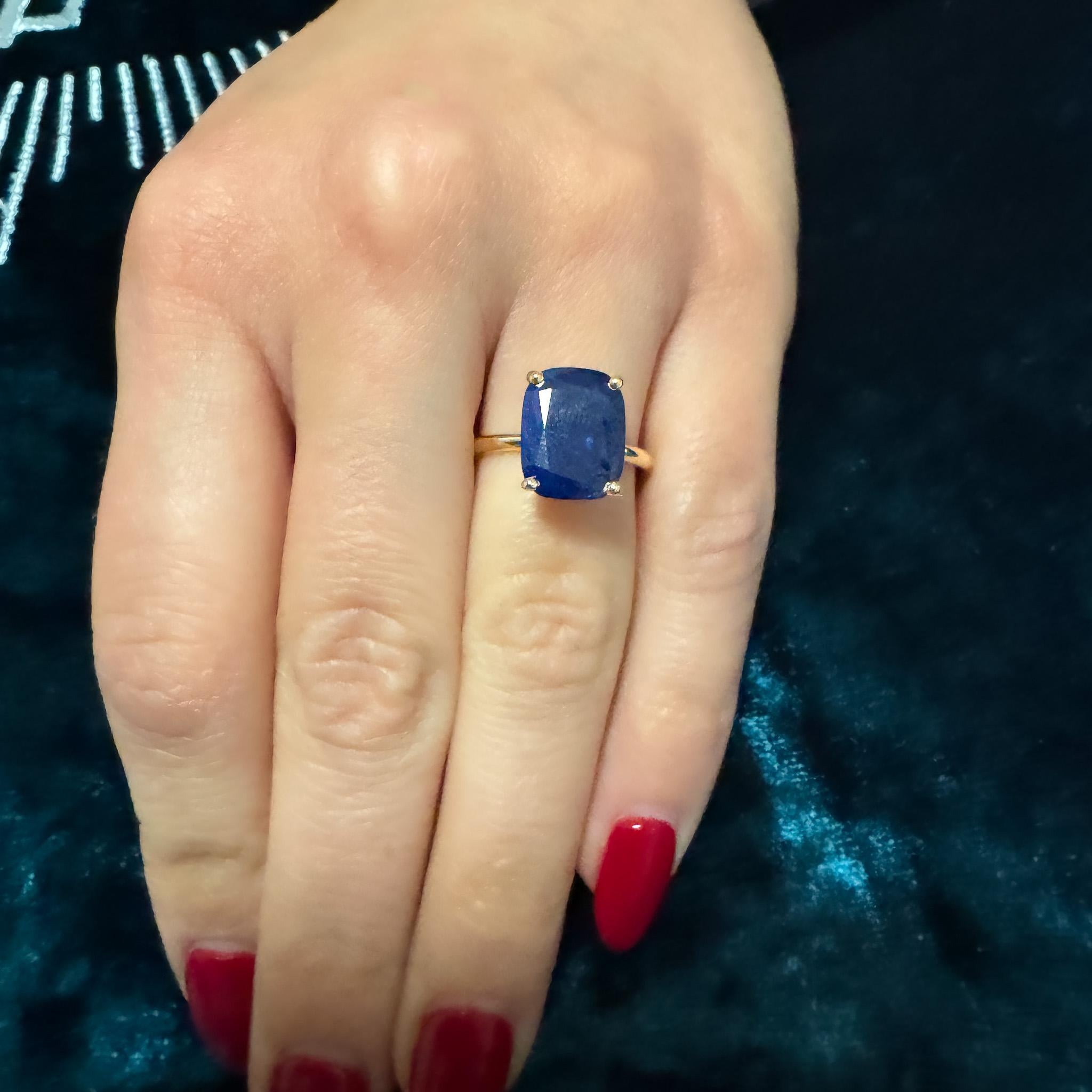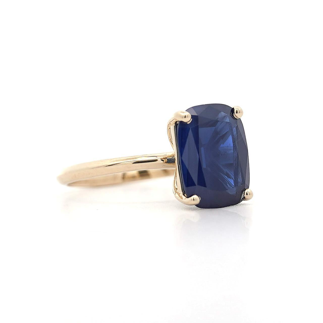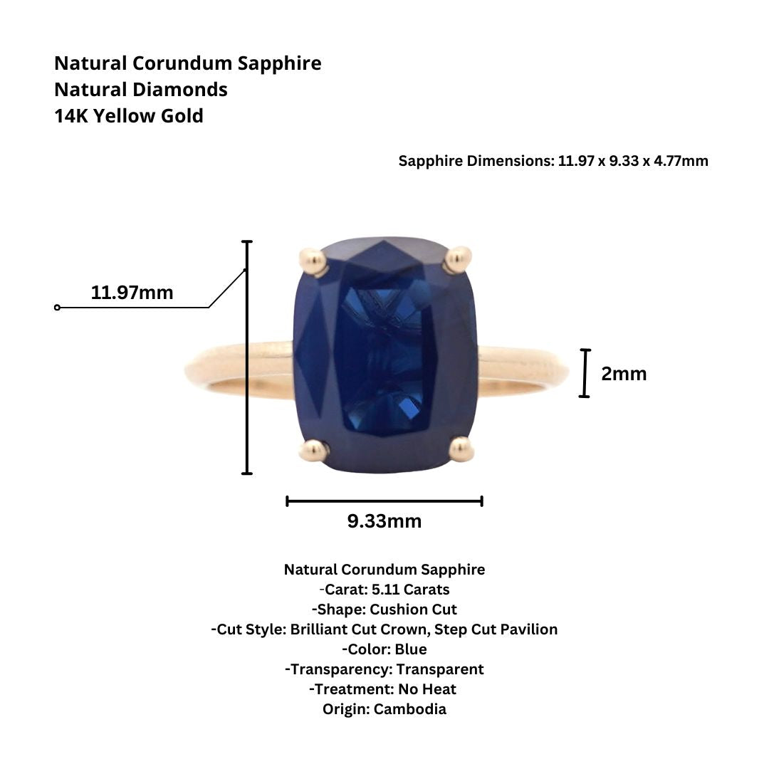 Design & Construction Four prong setting secures the cushion cut sapphire with minimal metal contact maximizing stone visibility and light entry. High-polish 14K yellow gold provides warm contrast against the deep blue sapphire creating classic color combination. Smooth 2mm band offers comfortable wear while maintaining elegant proportions. The elevated prong setting showcases the sapphire's substantial size and depth. Yellow gold prongs grip the sapphire securely at the corners allowing the stone to dominate the visual presentation.