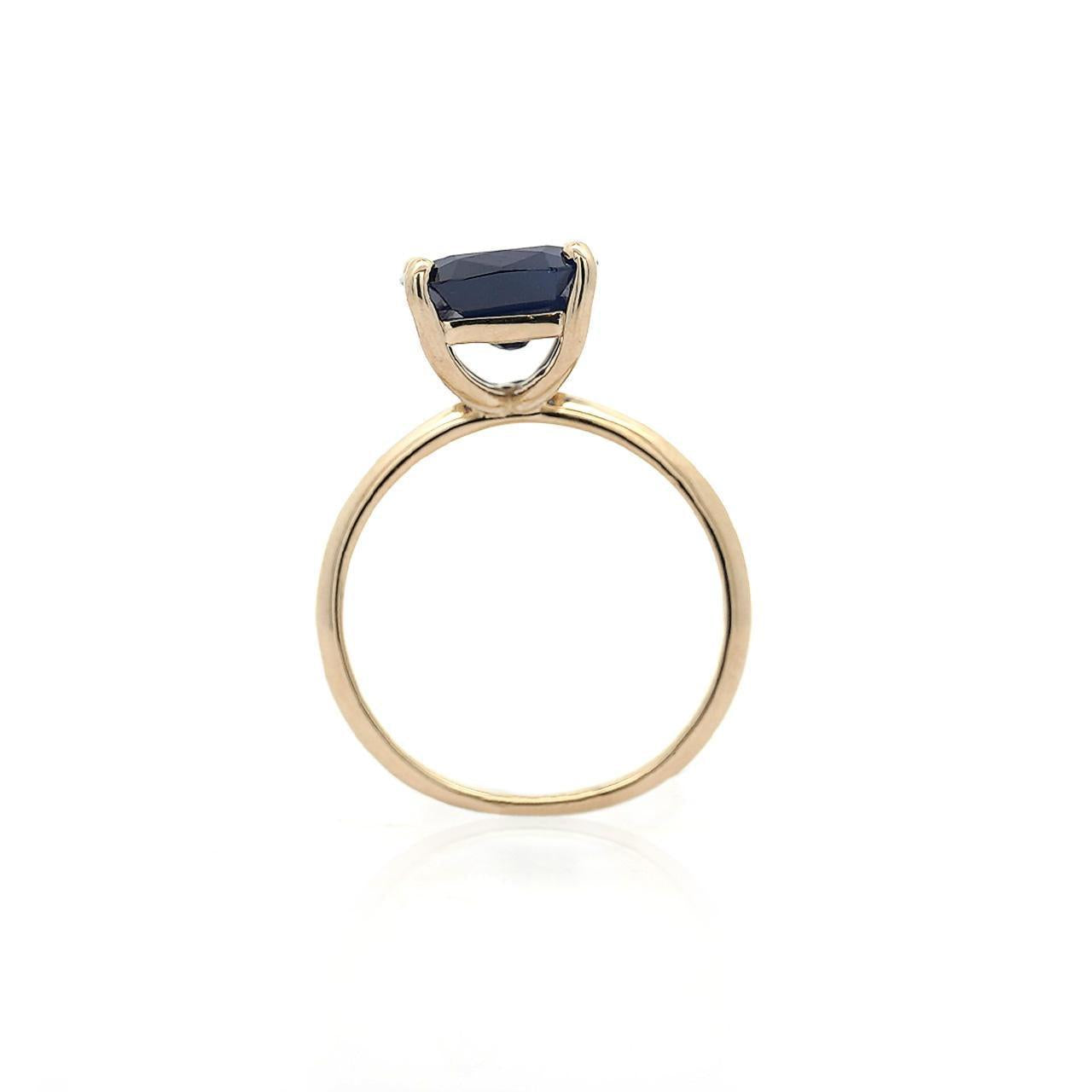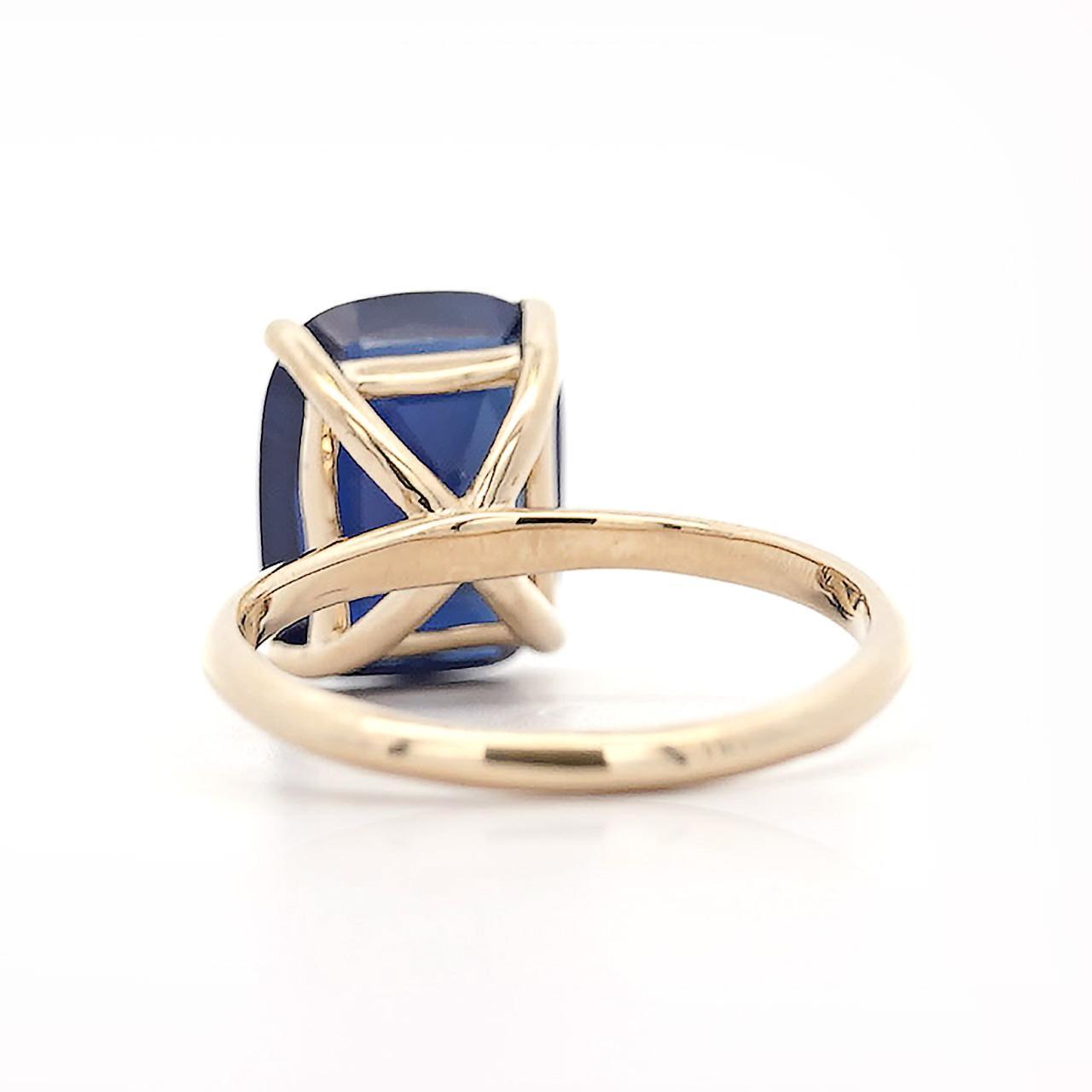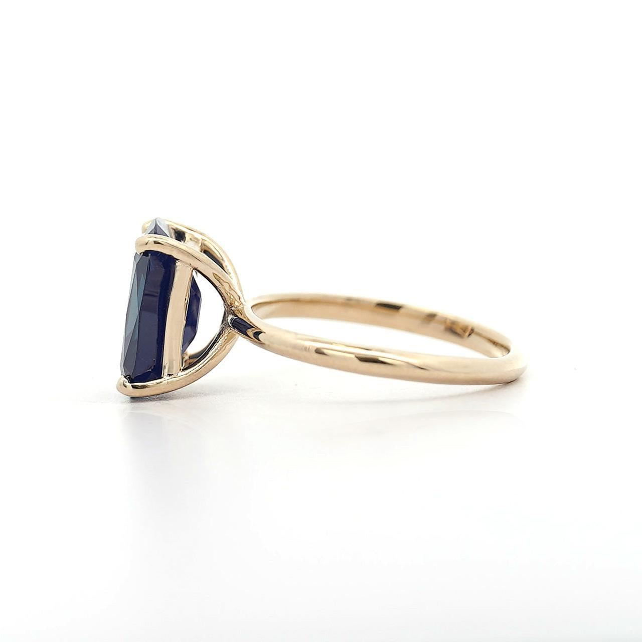 Design & Construction Four prong setting secures the cushion cut sapphire with minimal metal contact maximizing stone visibility and light entry. High-polish 14K yellow gold provides warm contrast against the deep blue sapphire creating classic color combination. Smooth 2mm band offers comfortable wear while maintaining elegant proportions. The elevated prong setting showcases the sapphire's substantial size and depth. Yellow gold prongs grip the sapphire securely at the corners allowing the stone to dominate the visual presentation.