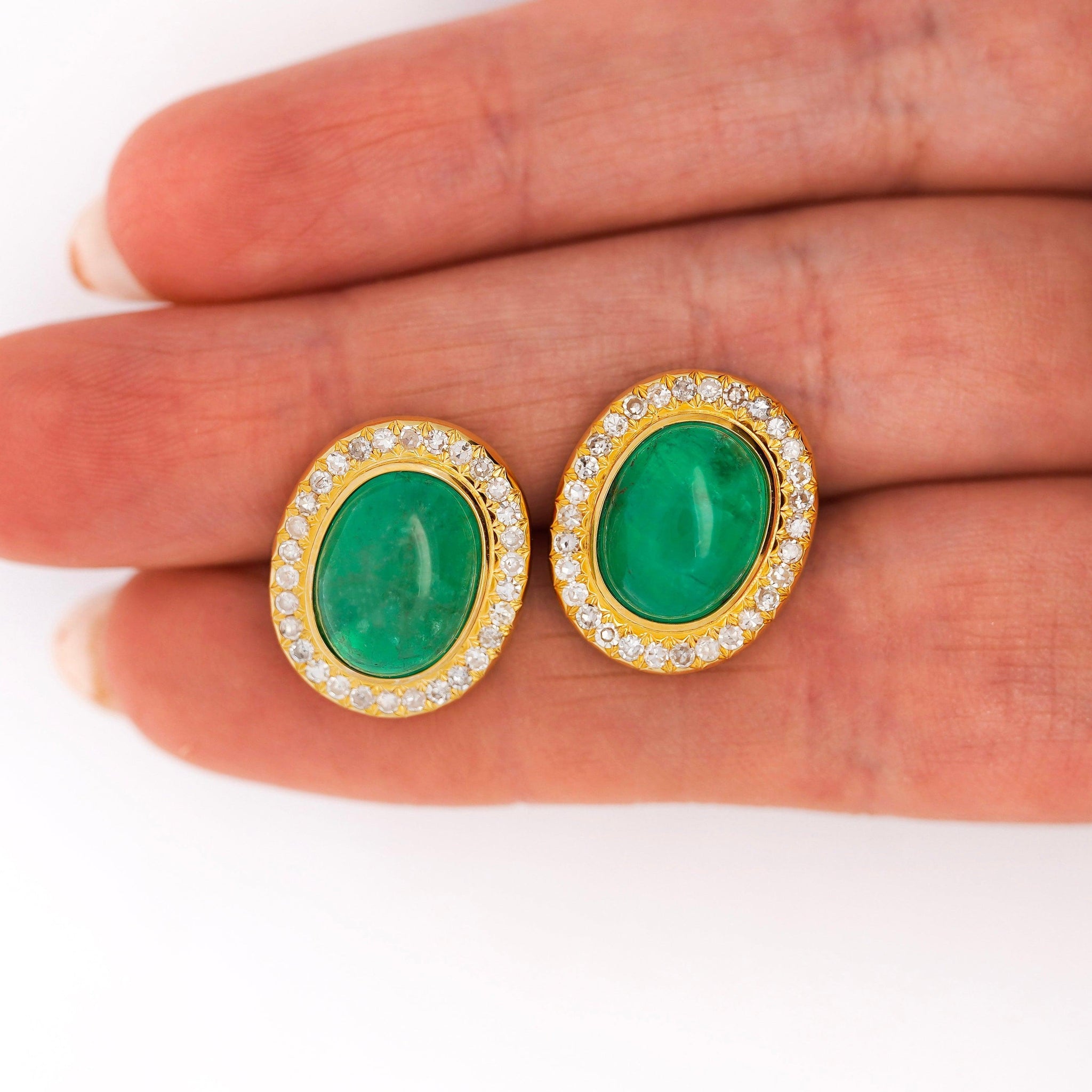 8.47 Carat Cabochon Emerald and Diamond Halo Earrings in 18K Gold