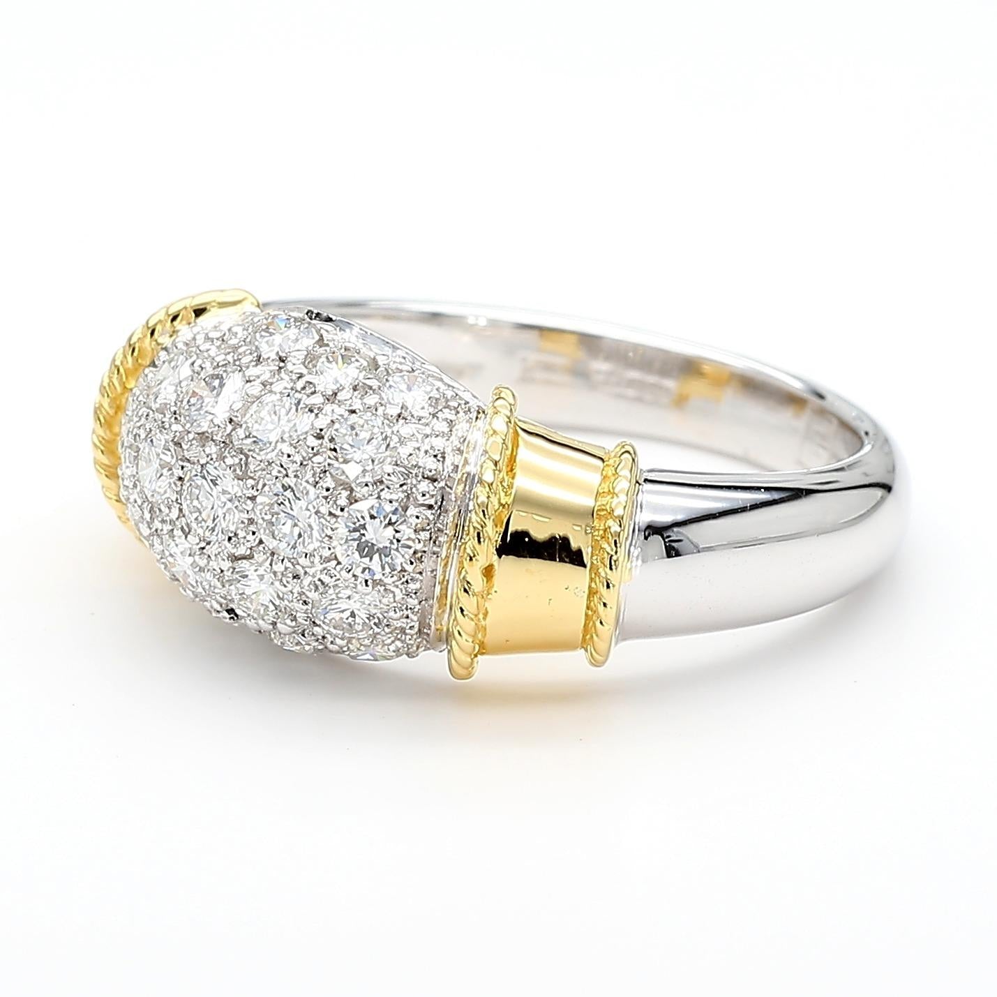 Two-tone band ring in platinum 900 and 18K yellow gold featuring pave-set round brilliant diamonds totaling 0.73 carats (E-F/VS) covering domed center section. Weighing 8 grams with 9mm width, size 6.5 adjustable.