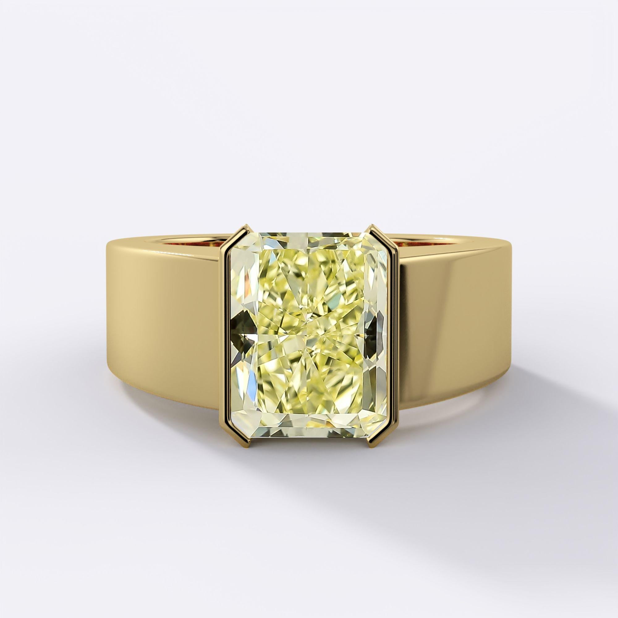 GIA certified 4.12 carat natural fancy yellow radiant cut diamond solitaire bezel set unisex ring in 18K two-tone gold.