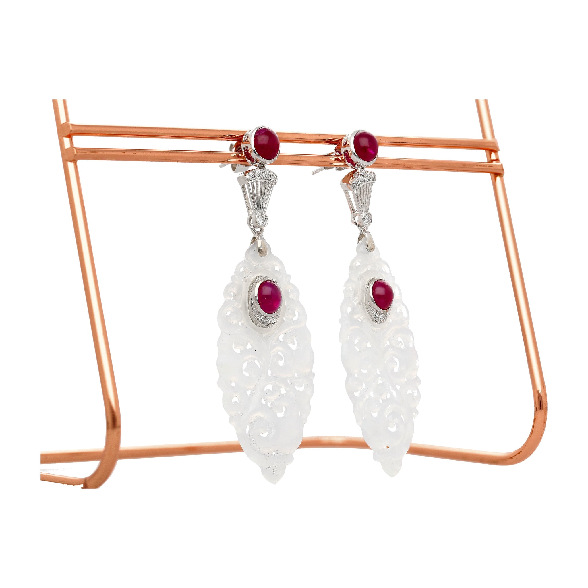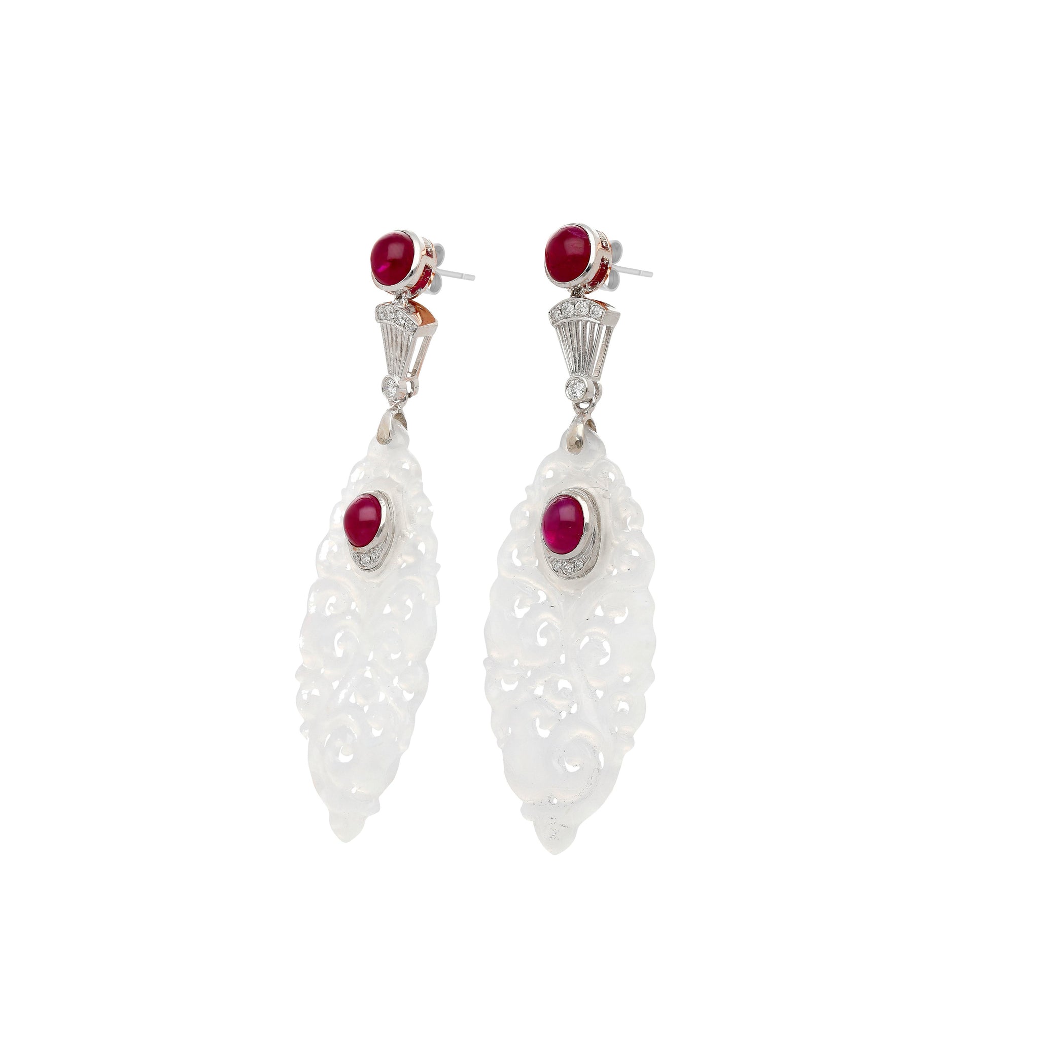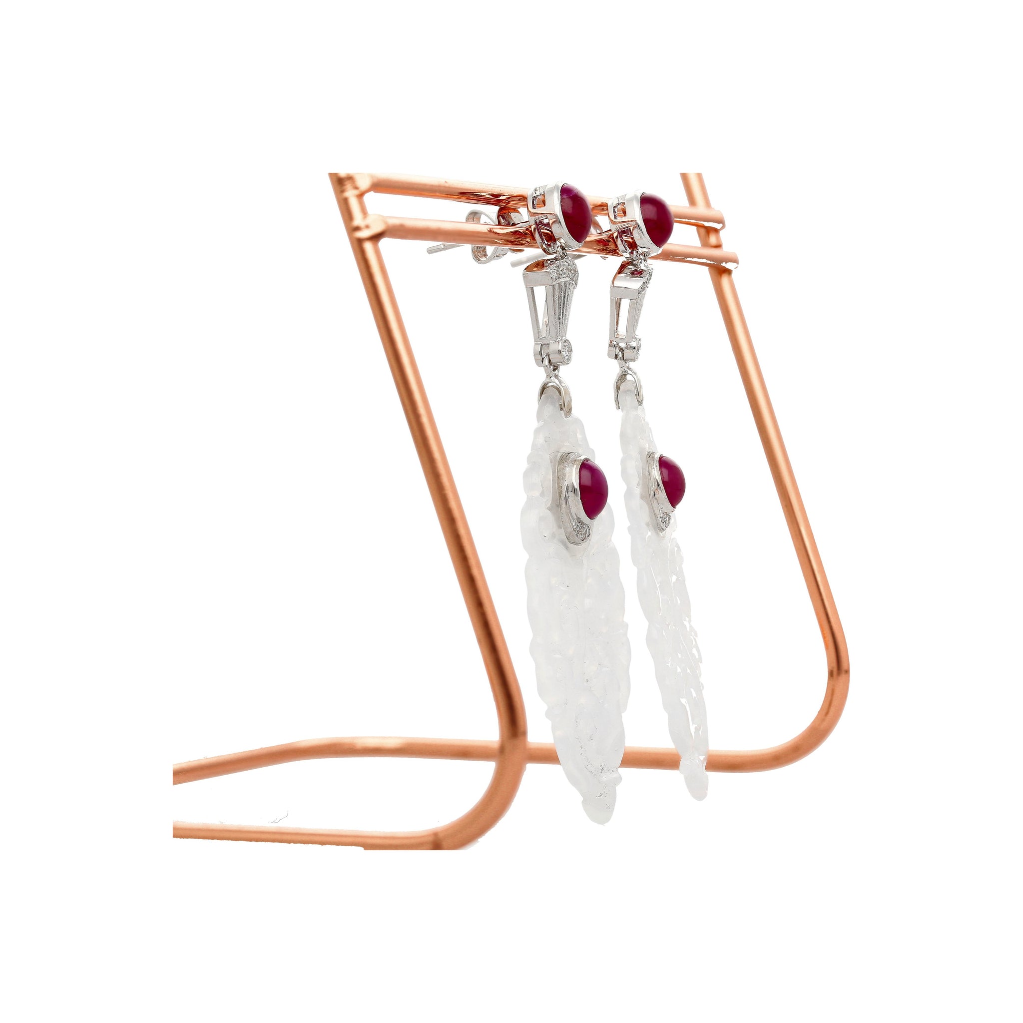 27.48 carat carved grade A untreated jadeite jade drop earrings. Adorned with 4 cabochon cut bezel set rubies, 4.47 cttw, and 10 round cut diamonds bezel set, 0.18 cttw.