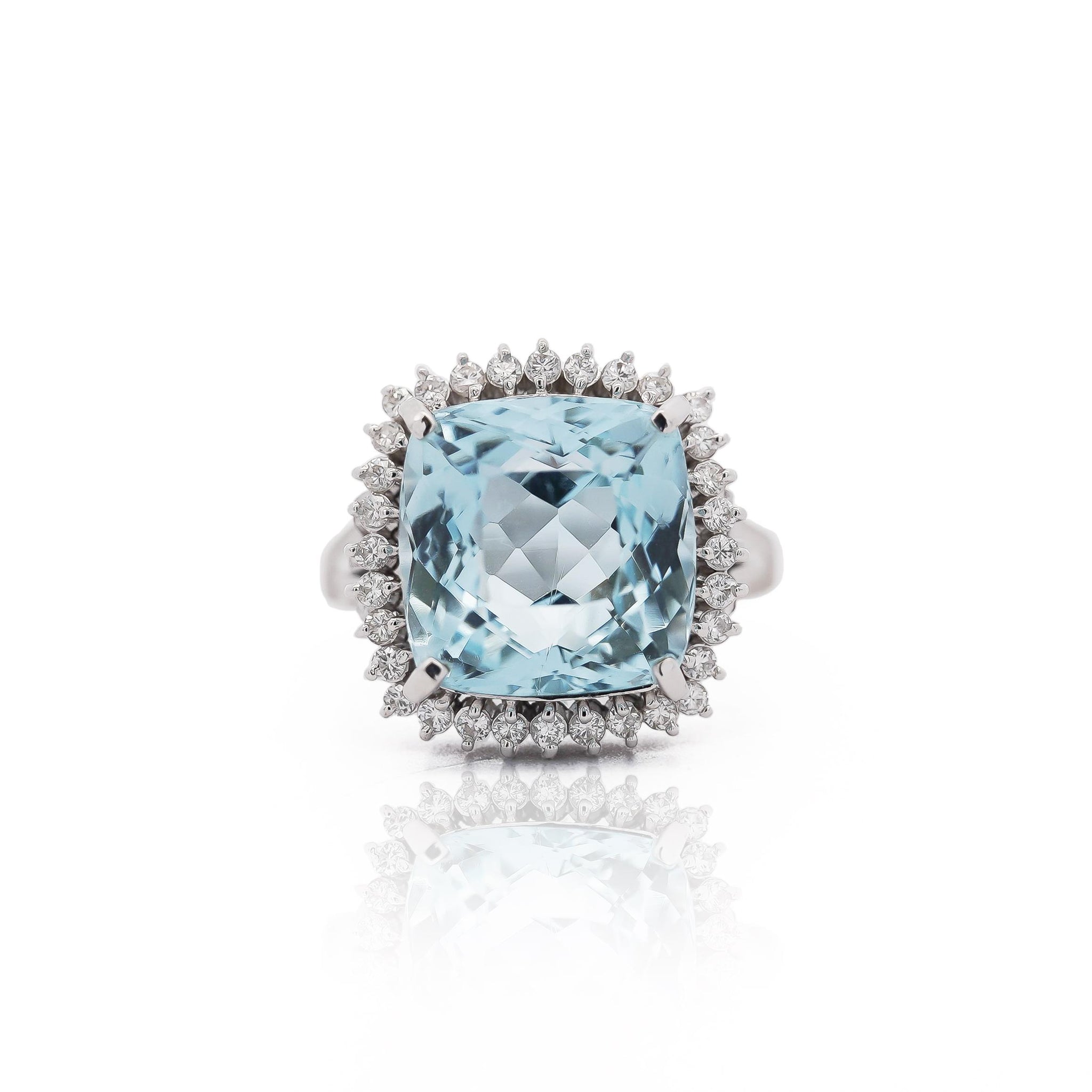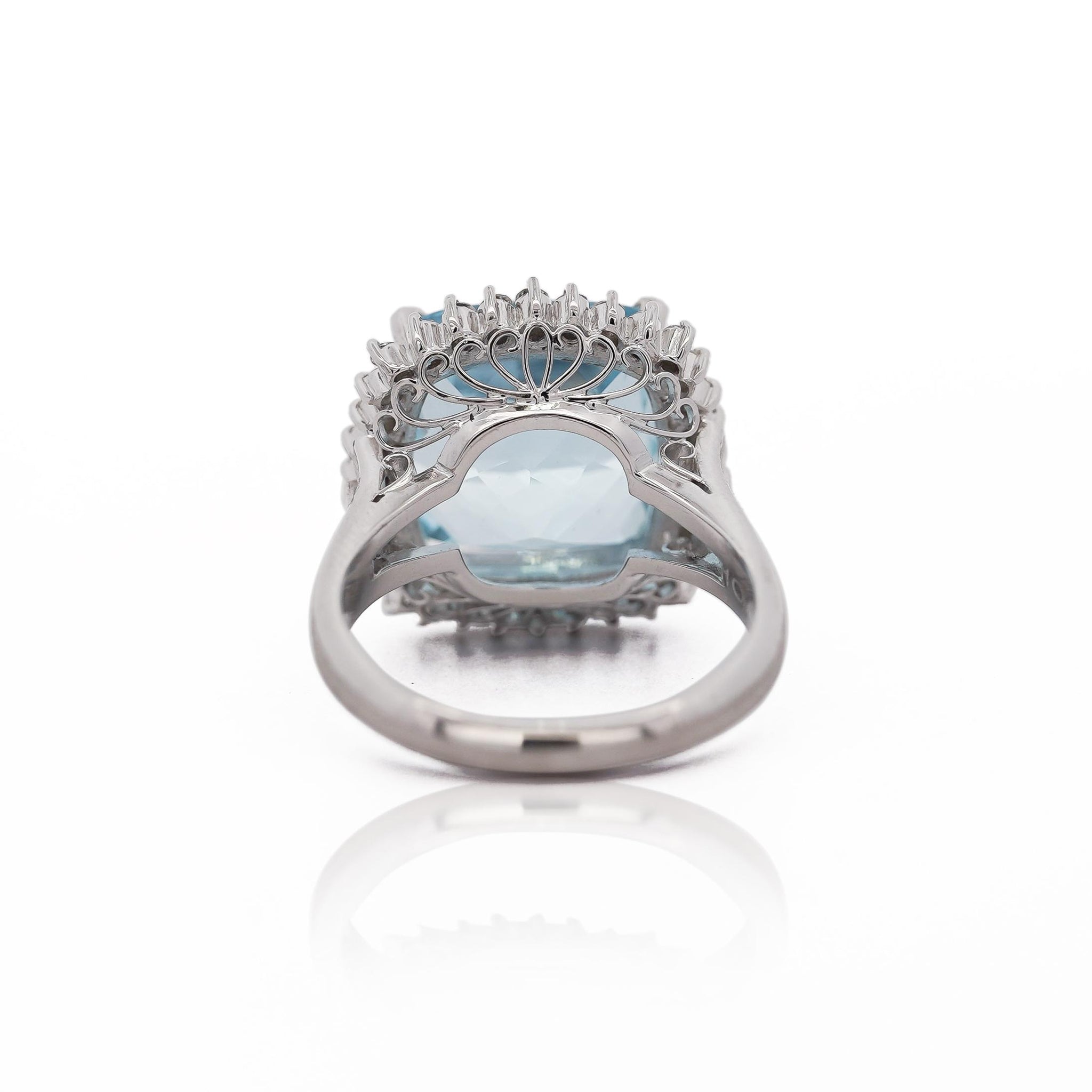 The cushion-cut aquamarine is secured in a four-prong setting that elevates the stone above the platinum framework, maximizing light entry for optimal brilliance. Thirty-two round brilliant diamonds form a complete halo in shared prong settings, creating continuous sparkle around the aquamarine perimeter. The gallery beneath features elaborate scrollwork filigree in traditional openwork technique, adding dimensional artistry visible from the profile view. Cathedral-style shoulders provide structural support while maintaining elegant lines. At 8.14 grams of platinum 900, the ring delivers a substantial presence with hypoallergenic properties ideal for sensitive skin.