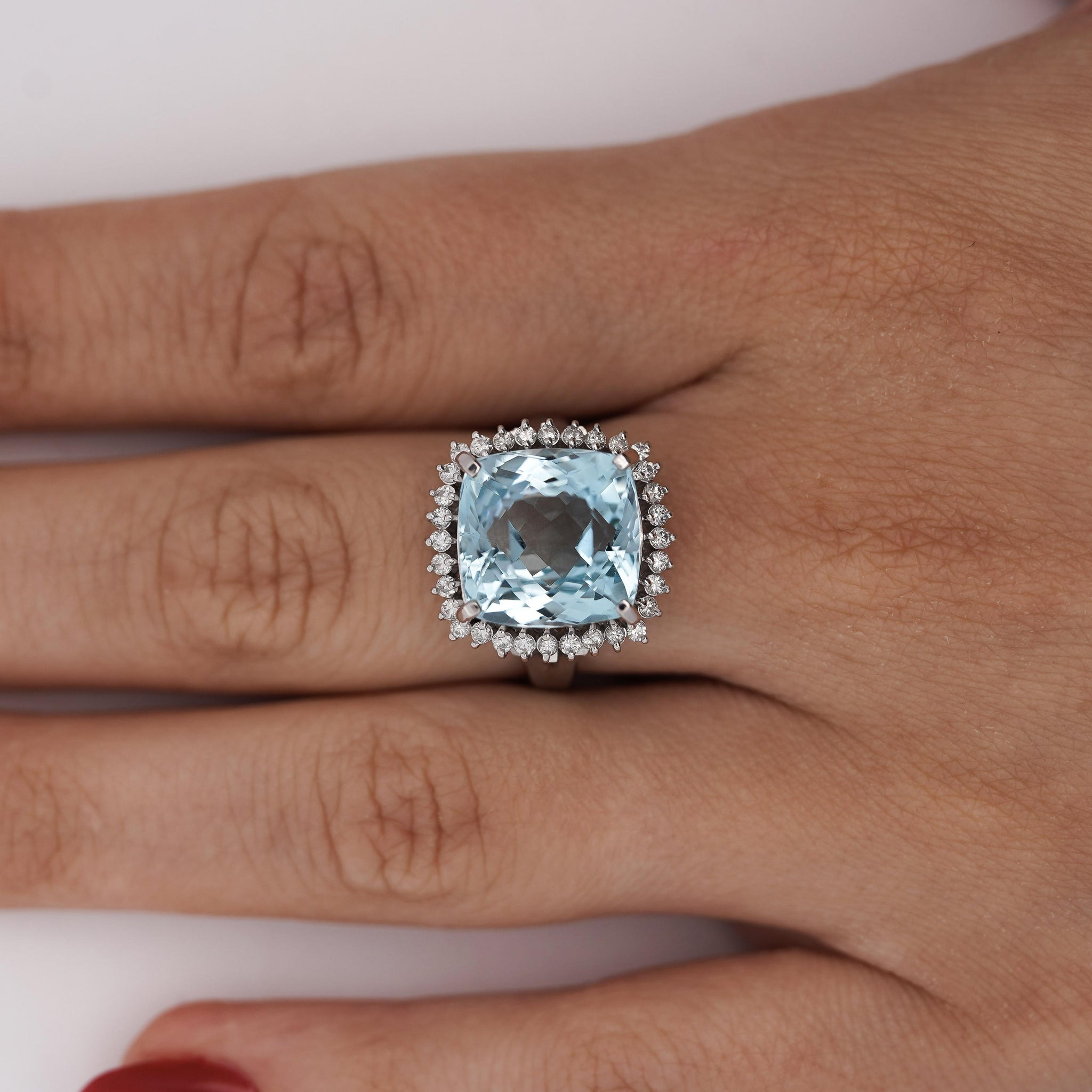 This 10.04 carat natural aquamarine displays the coveted sky-blue coloration with exceptional transparency and eye-clean clarity. The cushion checkerboard cut features a faceted crown surface with a checkerboard pattern that creates enhanced brilliance and visual texture. Measuring 12.5mm, the substantial size ensures impressive presence on the finger while the aquamarine's natural clarity allows light to pass through unobstructed, creating the gemstone's characteristic watery glow. Natural aquamarine derives its serene blue color from trace amounts of iron and belongs to the beryl mineral family, sharing its durability and crystal structure with emerald.