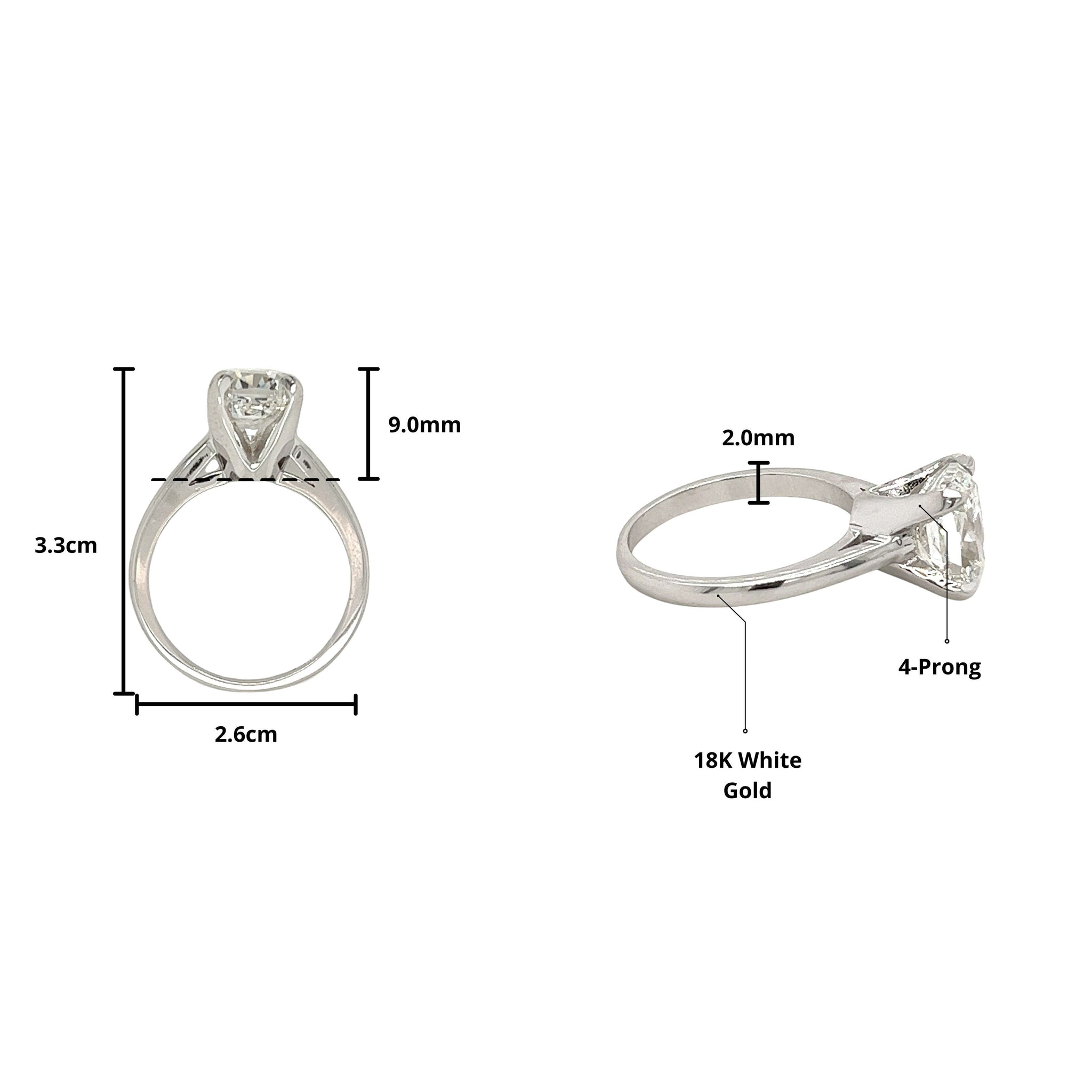 Une simple Bague en or blanc 18k avec une tige droite et un sertissage surélevé à 4 griffes. Le sertissage surélevé donne l'optique d'une pierre centrale plus grande, tout en étant déjà d'une taille considérable de 3,00 carats.