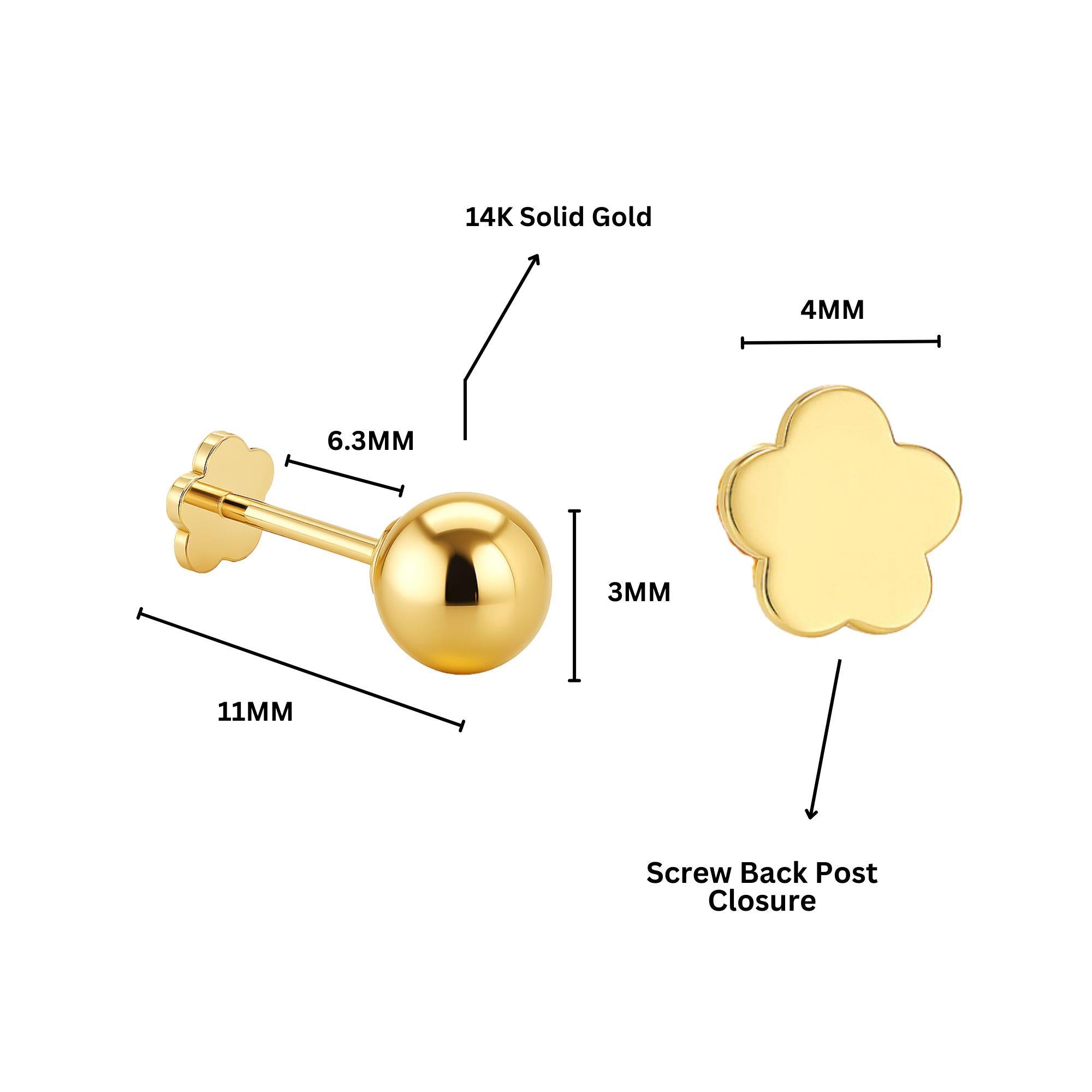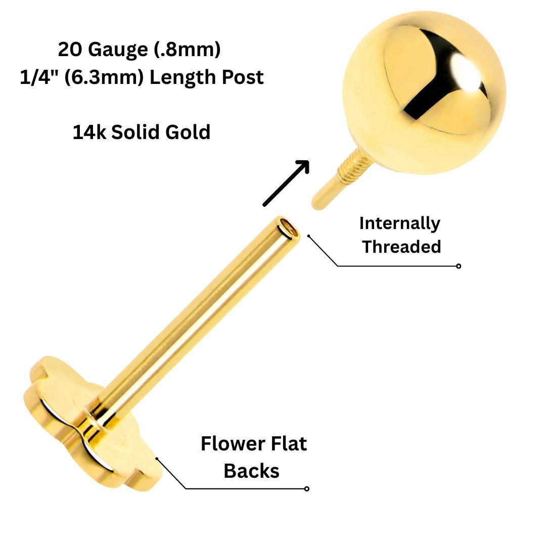 (20 Gauge (.8mm), 1/4" (6.3mm) Length Post, Solid 14k Gold, Internally Threaded, Flower Flat Back, 3mm Ball End)