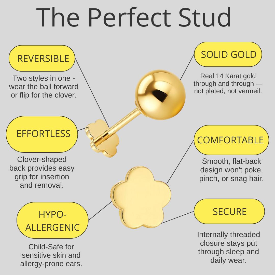 14K Solid Gold 3mm Ball Single Stud Earring Reversible To Clover Stud. Sold as a single.