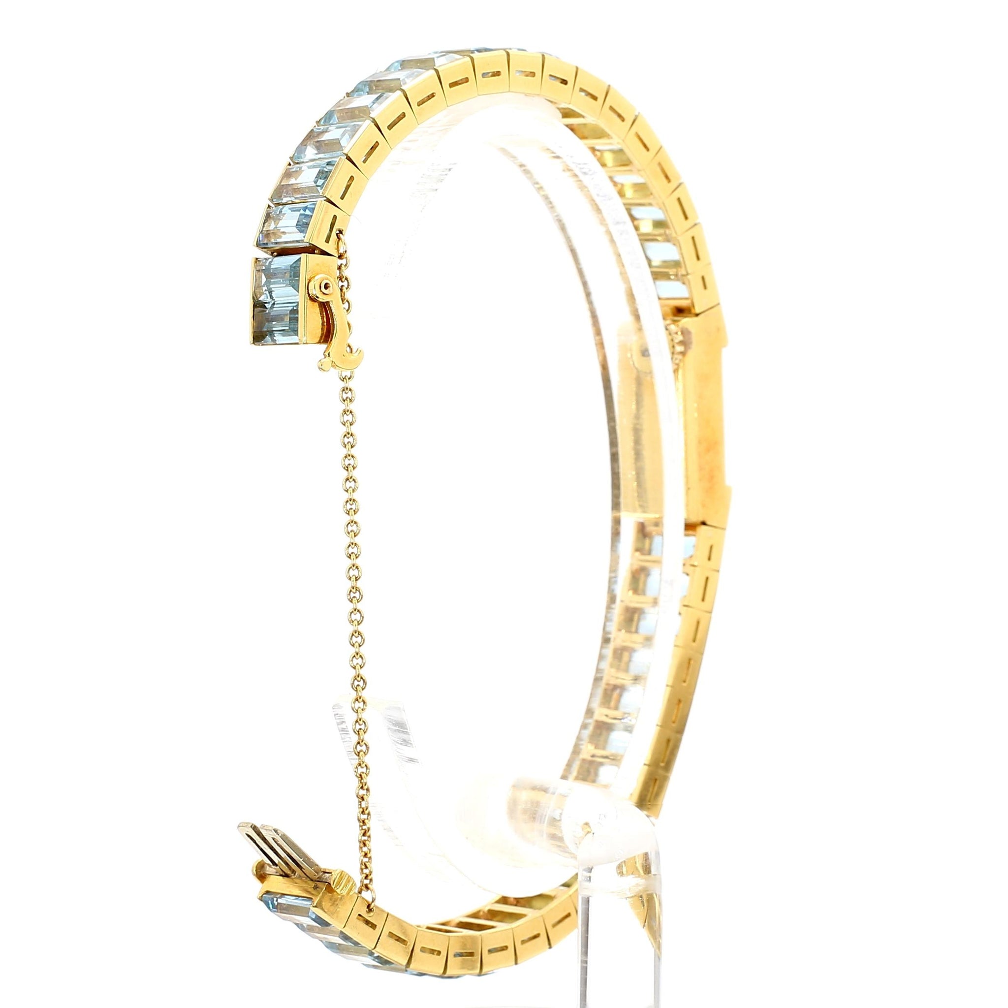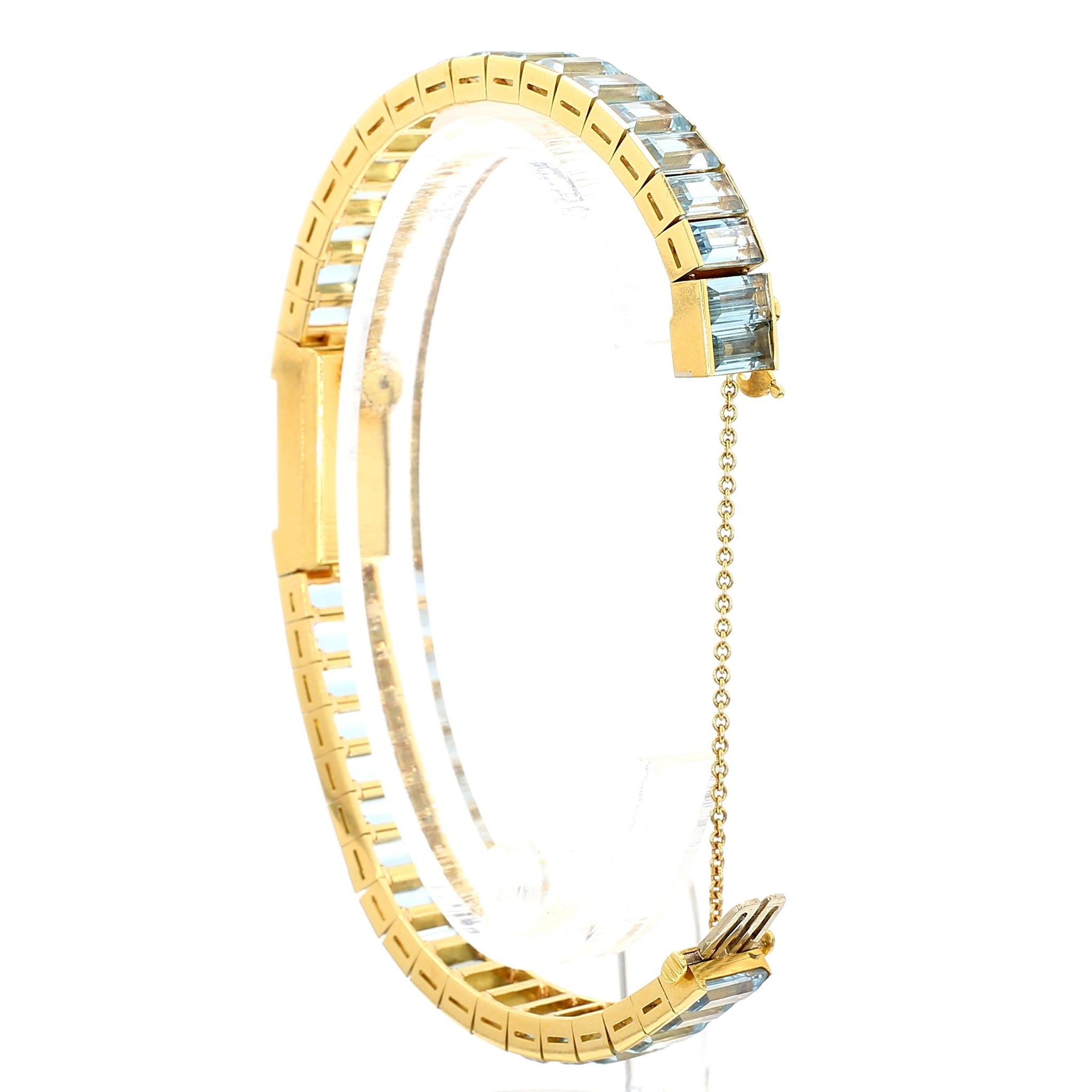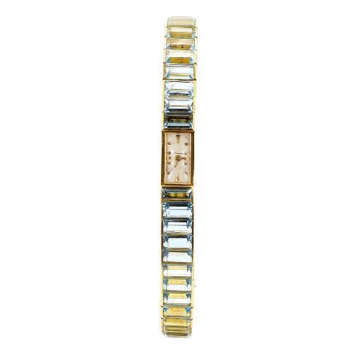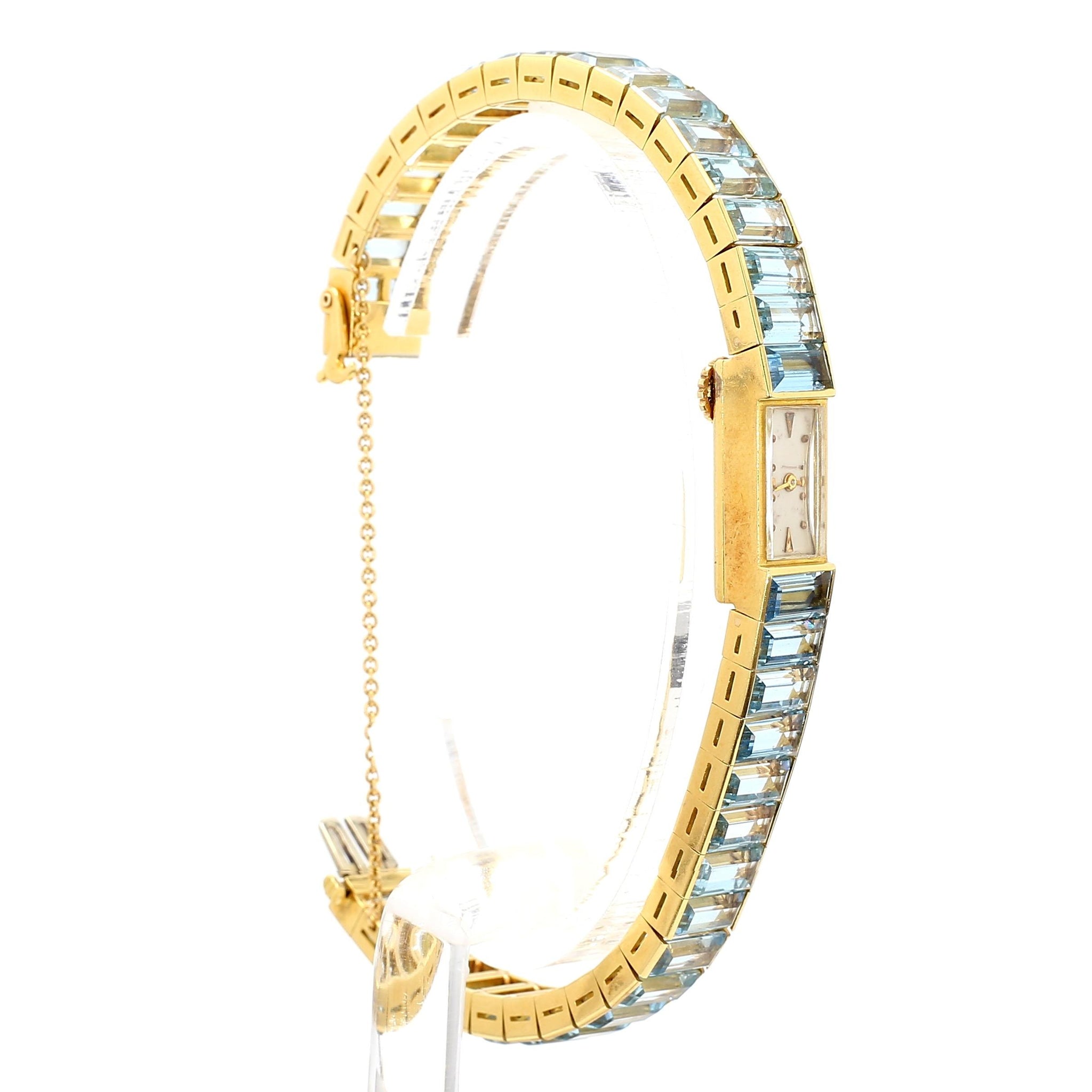 Vintage Blancpain Rayville Swiss made ladies watch in 14K yellow gold featuring a channel set emerald cut aquamarine bracelet. Manual wind movement with 17 jewels. A classic mid-century design with gemstone accents.
