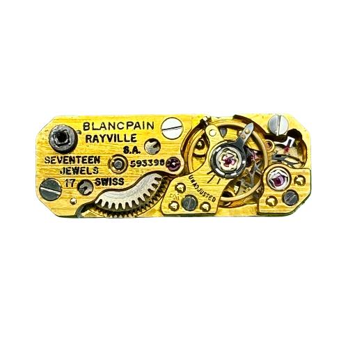 This exceptional Blancpain Rayville watch showcases the Swiss manufacturer's renowned craftsmanship with elegant 14K yellow gold construction and distinctive emerald cut aquamarine gemstone accents. The 17-jewel manual wind movement provides reliable Swiss precision while the aquamarine gemstones add unique color and luxury to the classic design. This combination of fine watchmaking and gemstone artistry represents the pinnacle of mid-century luxury timepiece design.