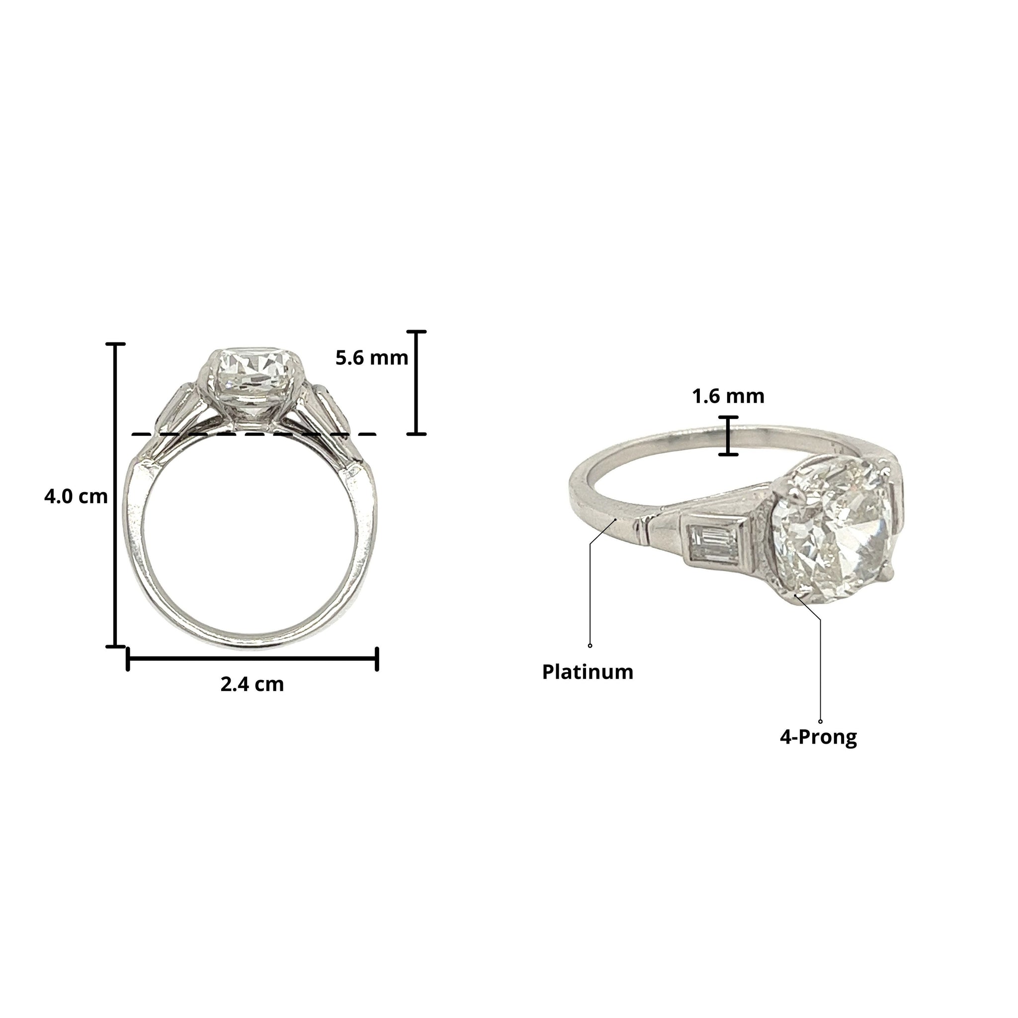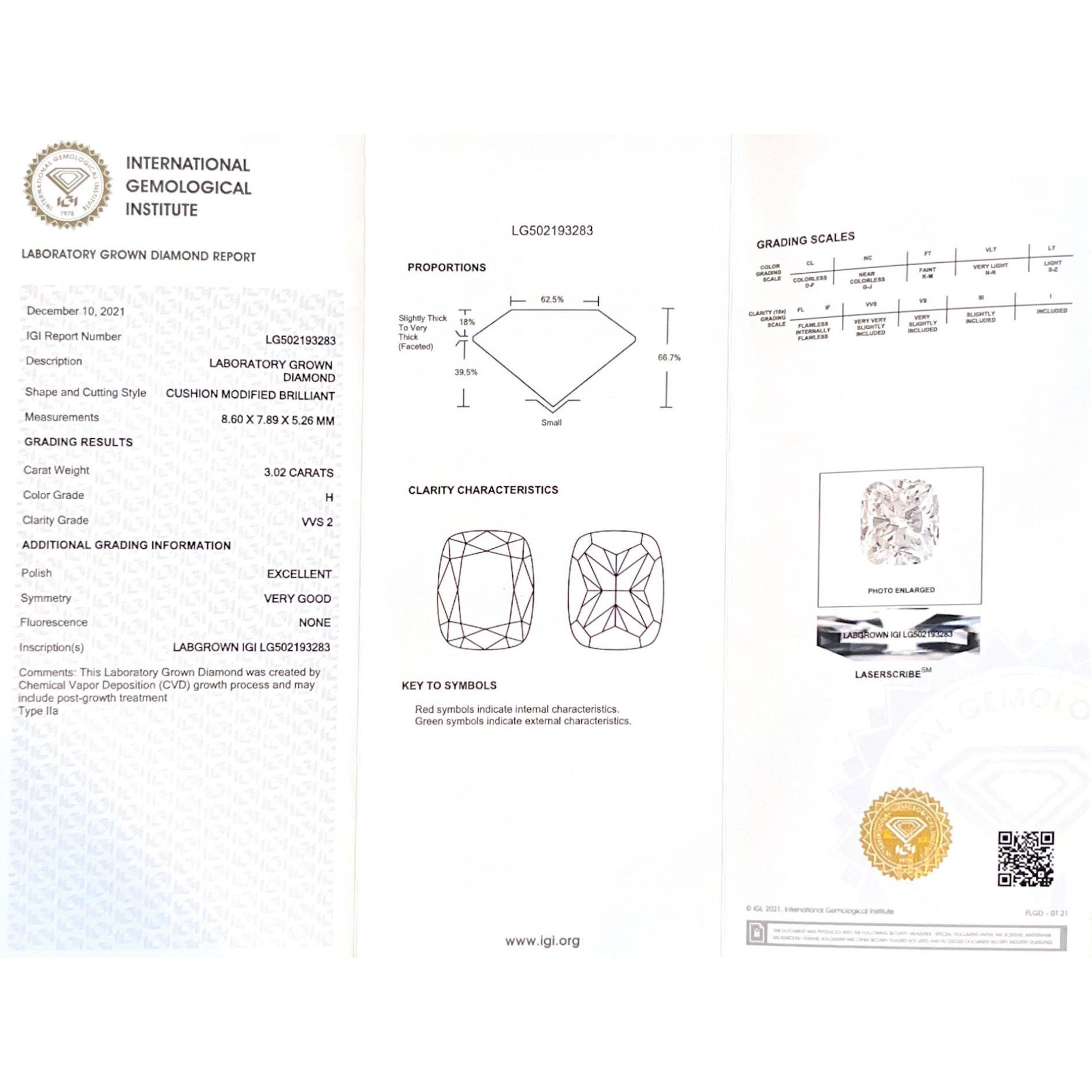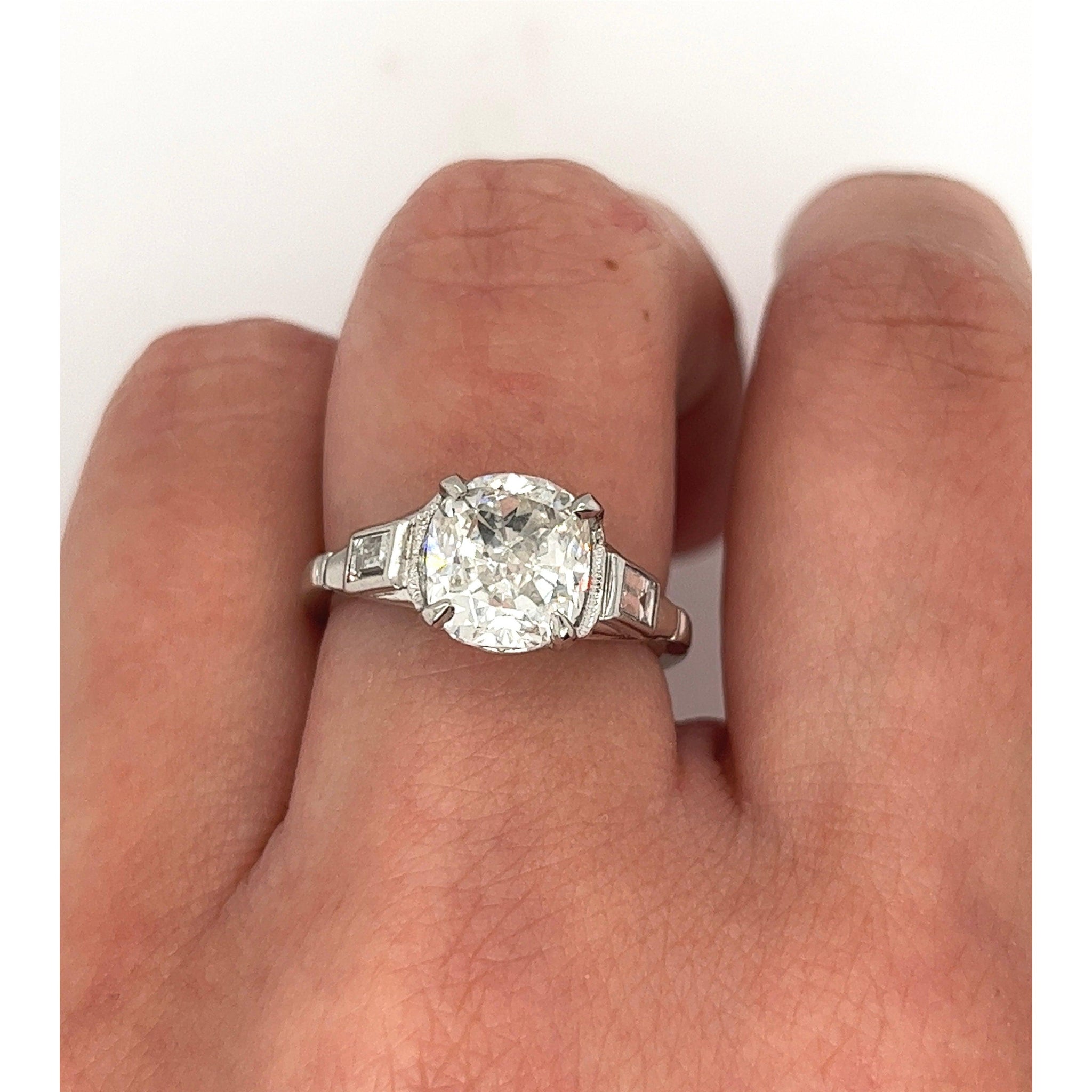 3.02 Carat Cushion Cut Lab Diamond Engagement Ring. Cushion cut, H color, VVS2 clarity. This 3ct lab-grown diamond engagement ring is mounted in a vintage-style, 3-stone, platinum setting. Paired with 2 baguette-cut diamond side stones.