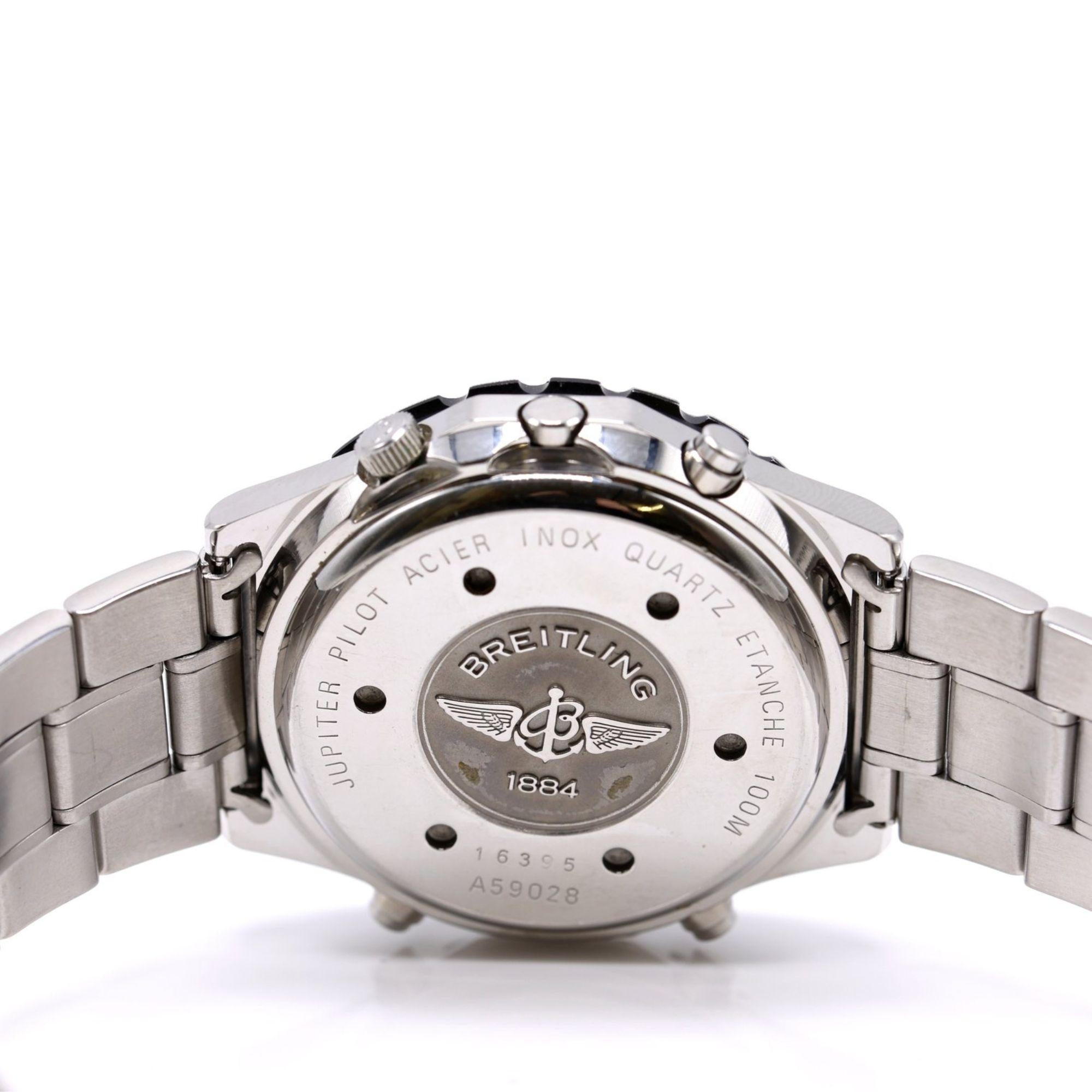 Breitling Jupiter Pilot collection represents the brand's aviation chronograph heritage with multi-function quartz movements. The slide-rule bezel maintains Breitling's tradition of functional aviation tools dating back to the original Navitimer. Reference A59028 combines chronograph timing with alarm complication providing dual timing functions. Quartz movement delivers reliable accuracy with battery power eliminating winding requirements. Jupiter Pilot watches remain collectible among aviation enthusiasts and Breitling collectors. The watch shows visible wear consistent with use, adding character and authentic patina to this aviation tool watch.