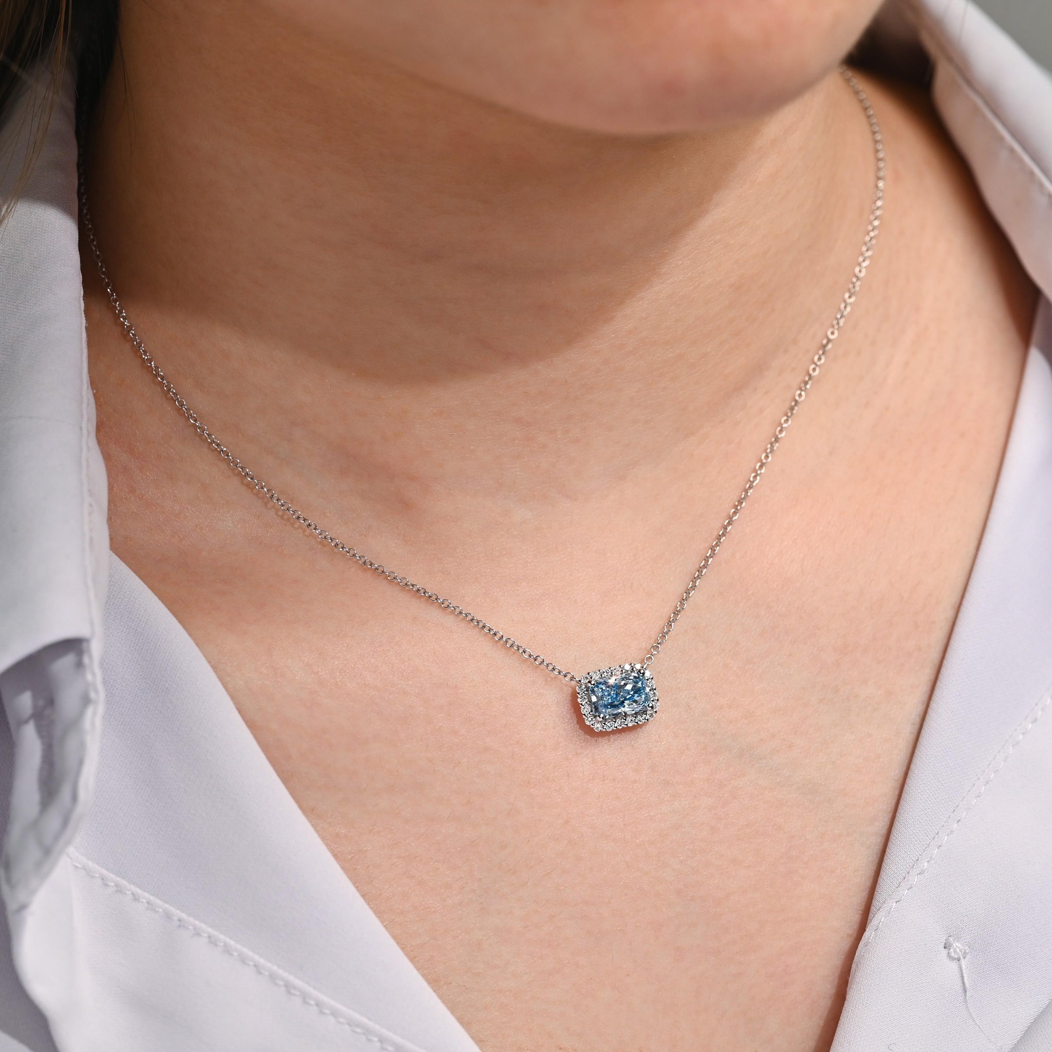 Lab Grown blue diamond pendant necklace in 14K white gold featuring 1.52 carat radiant cut blue diamond surrounded by 0.20 carats of white diamonds. Adjustable cable chain included, weighs 2.41 grams total.