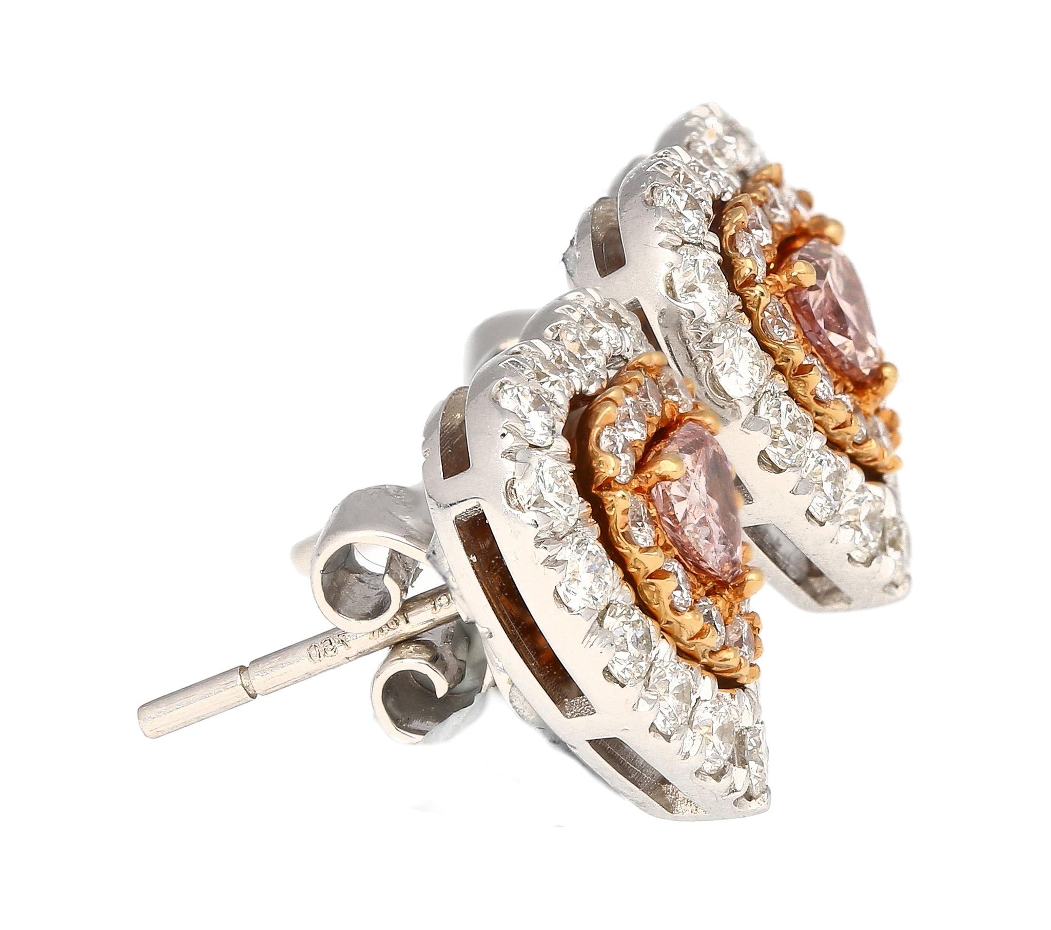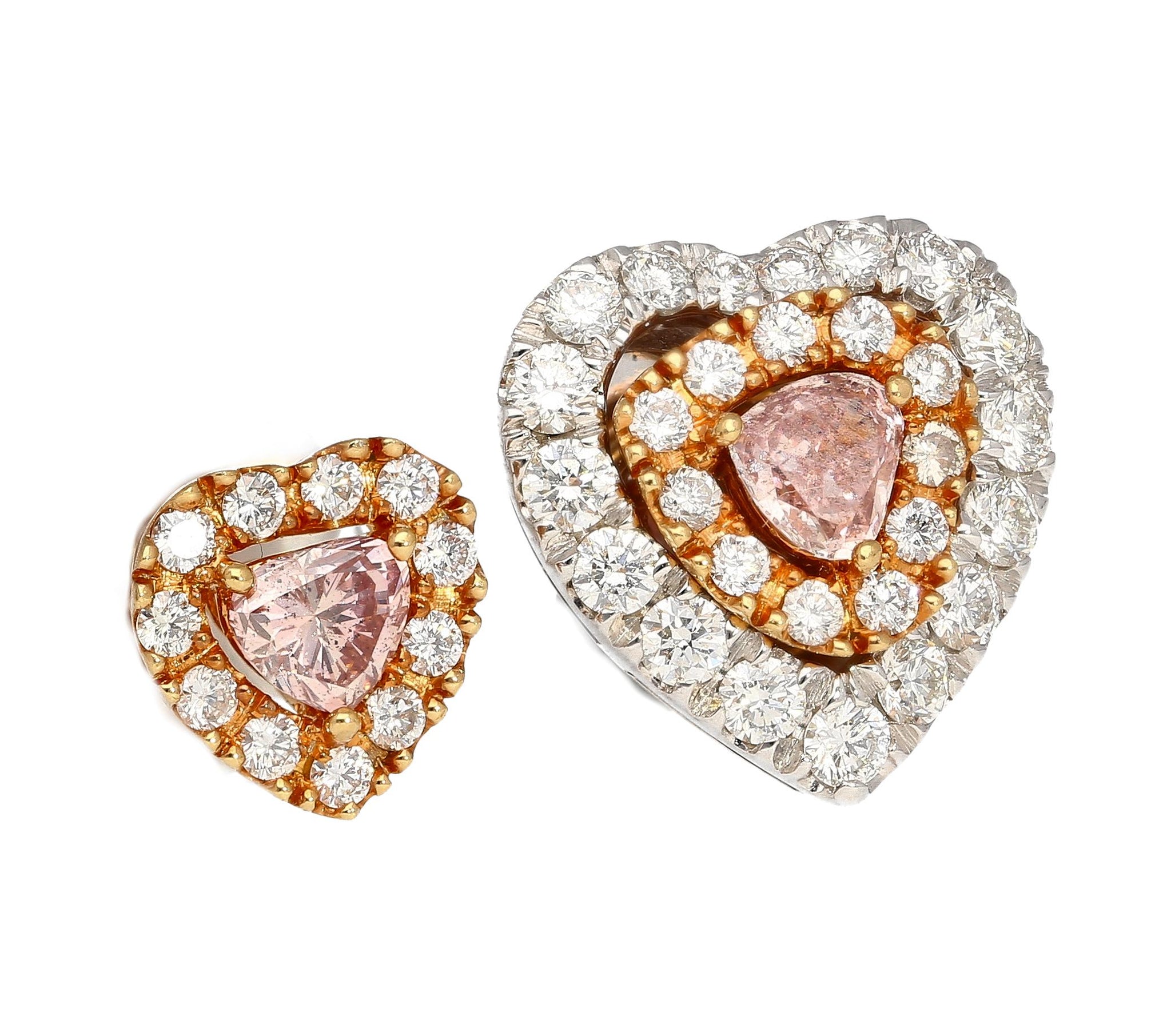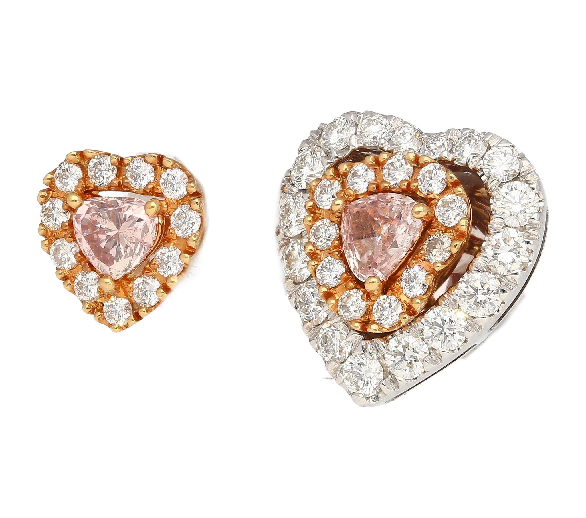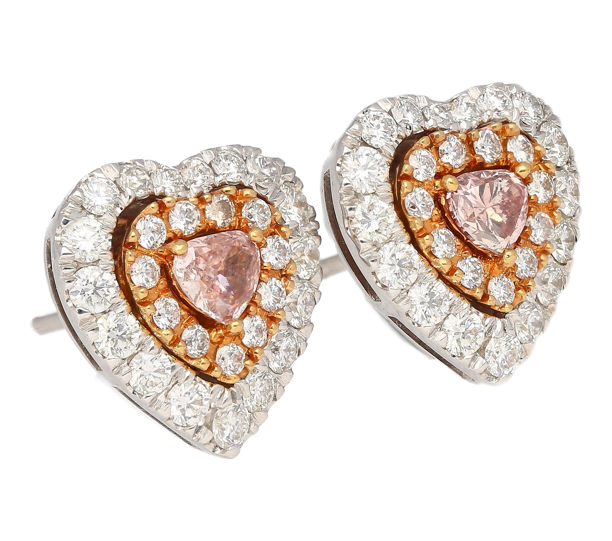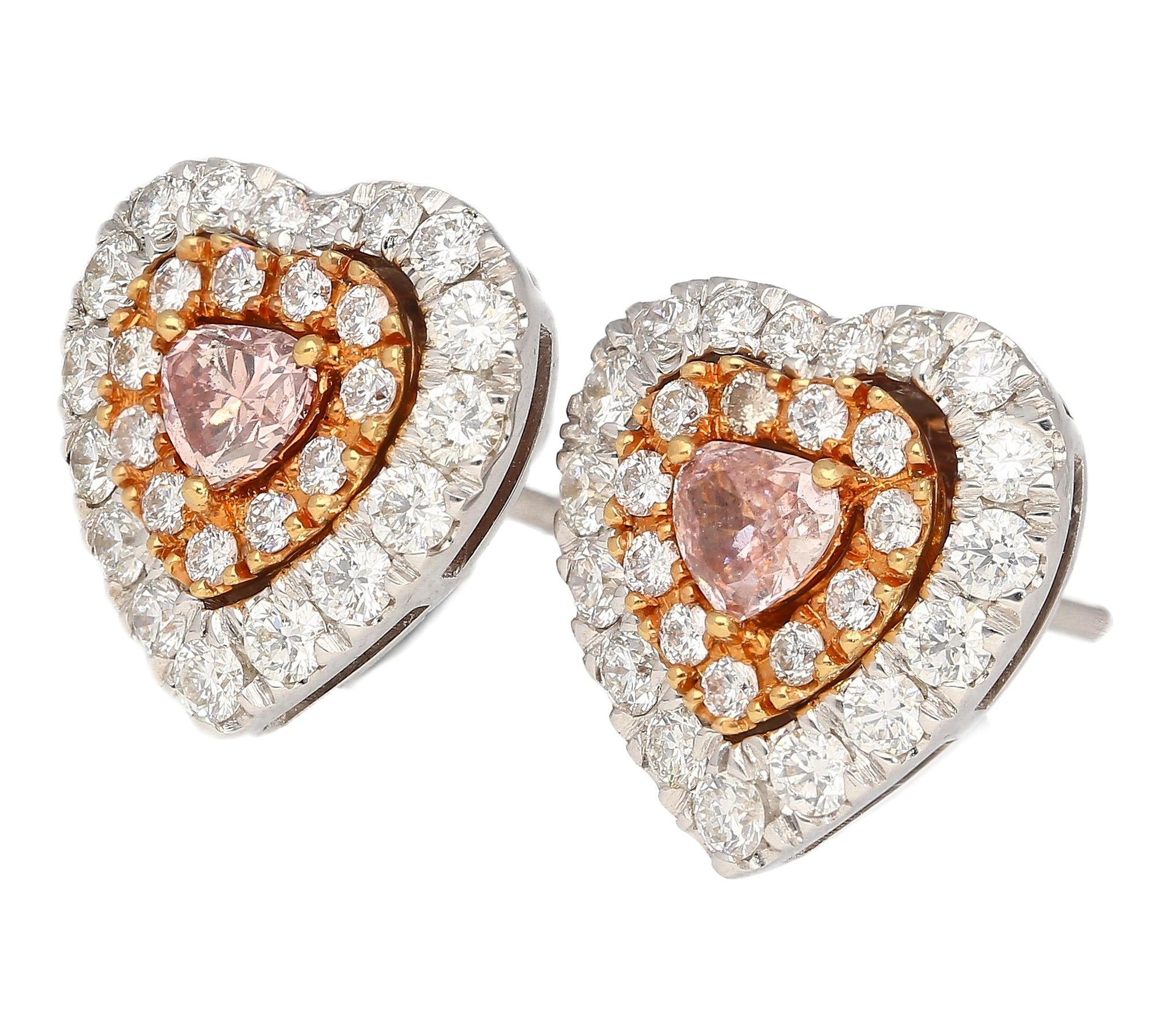 The Heart-Shape Pink Diamond stud earrings feature two GIA certified Fancy Brown Pink diamonds totaling 0.45 carats, each cut as a modified heart brilliant with natural color and even distribution. The center diamonds measure 3.68 x 4.09 x 2.52 mm and 3.84 x 4.16 x 1.92 mm and are set in a combination of platinum and 18K rose gold. The earrings are further set with 54 round brilliant cut diamonds totaling approximately 1.00 carat. Total weight 3.53 grams. GIA reports #6223051459 and #6224051454.