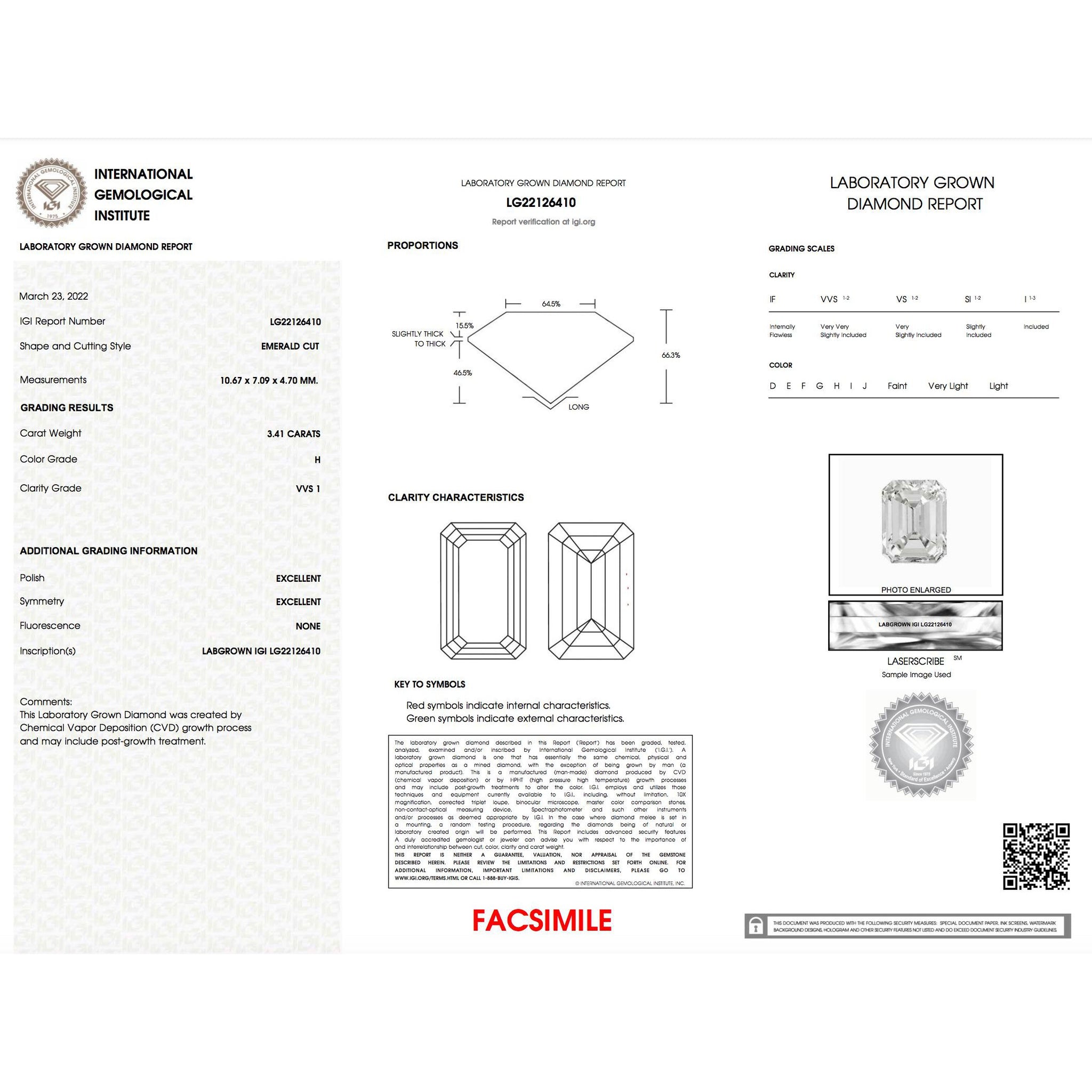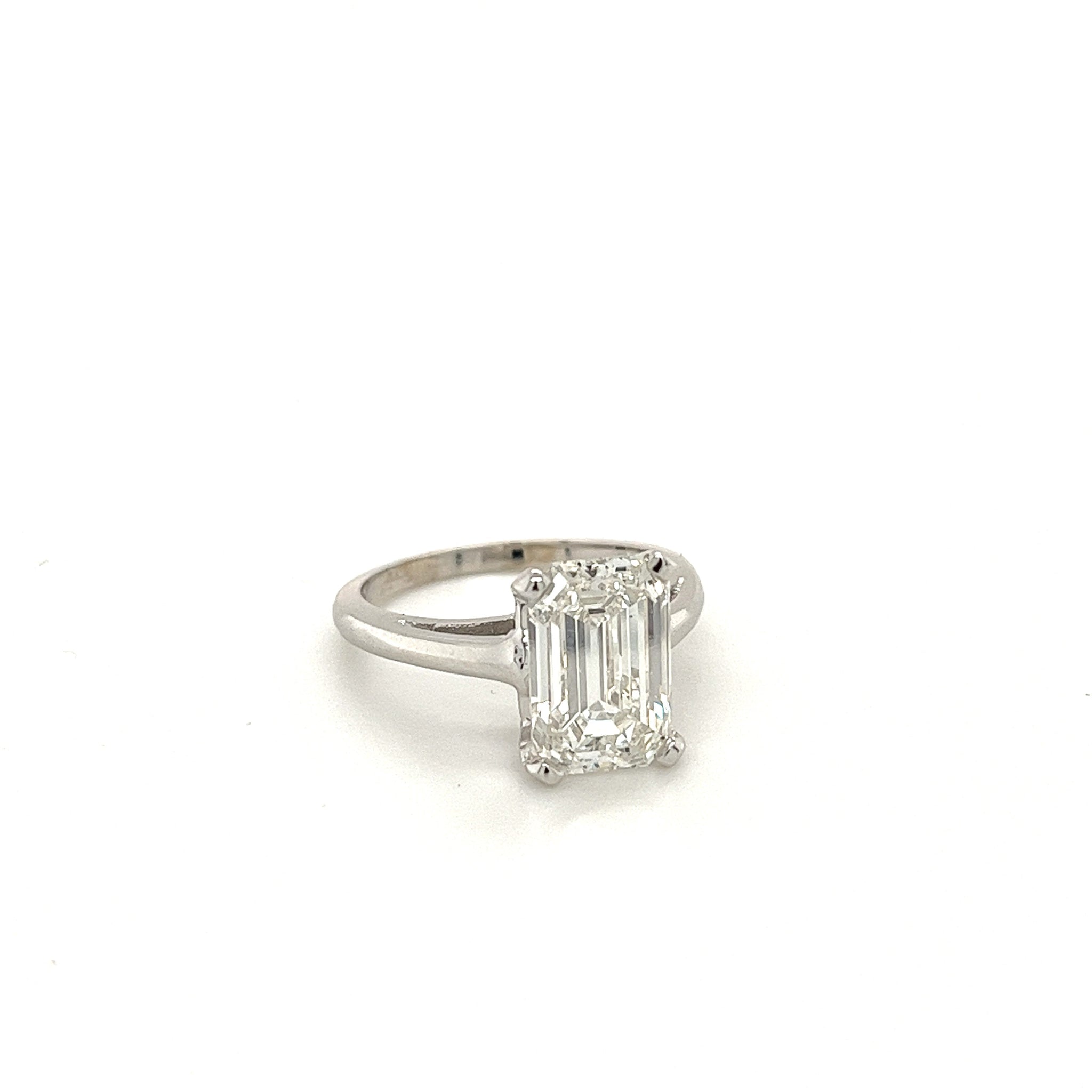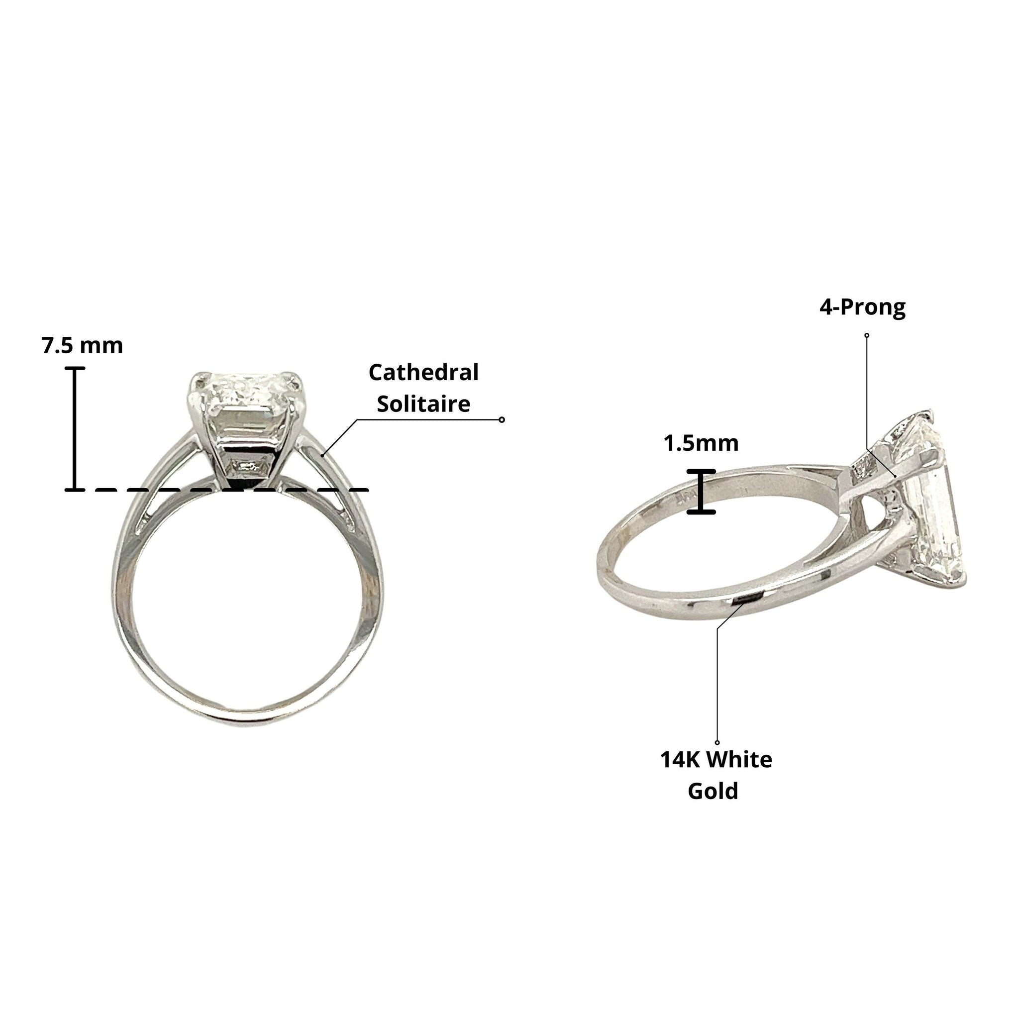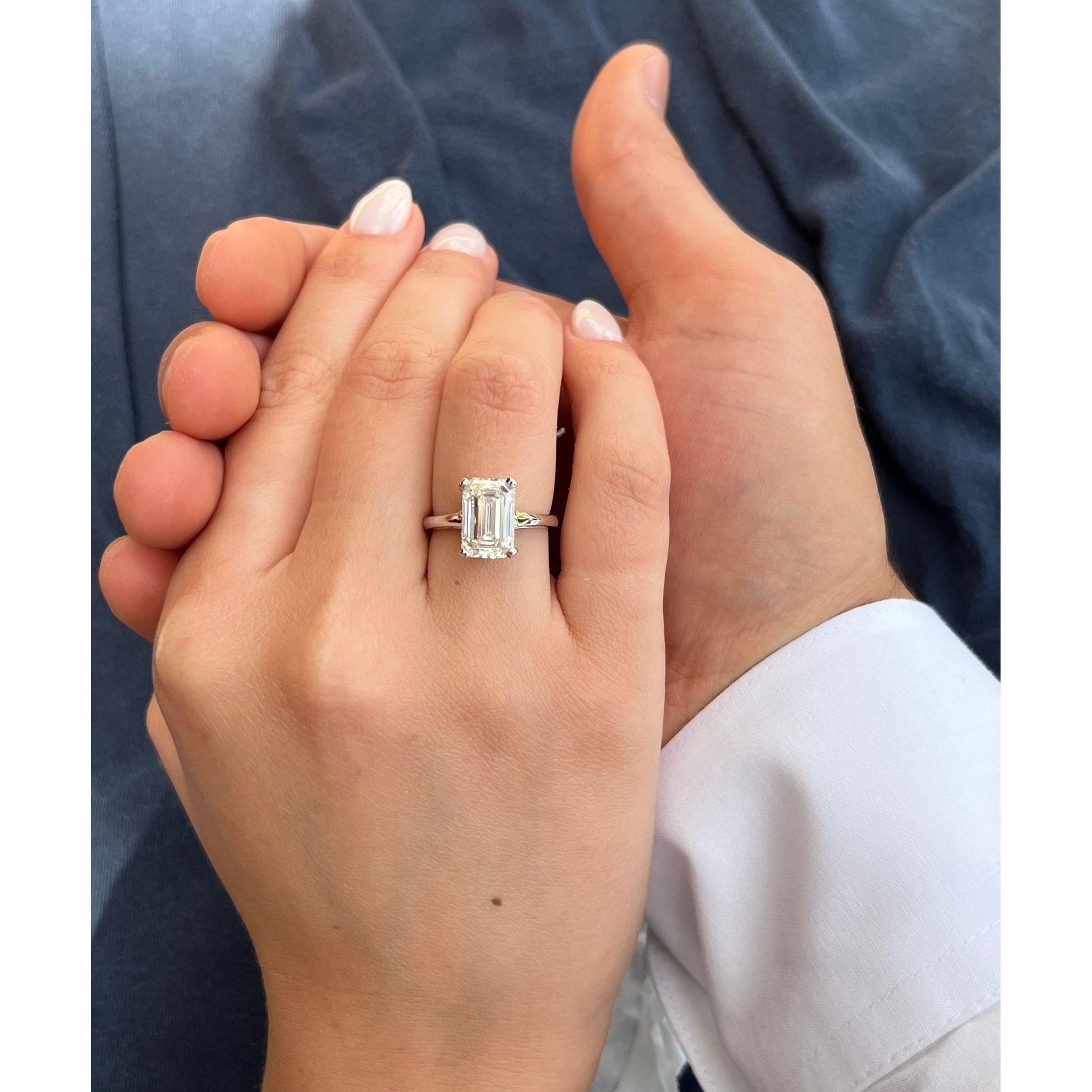 3.41 CARAT Emerald Cut Lab Diamond Engagement Ring in 14k white gold solitaire ring. Emerald cut, H color, VVS1 clarity. This diamond ring is the perfect buy for those in search of a simple band that lets the diamond speak for itself. The diamond features no inclusions of any kind to the naked eye and a large face that is not too deep. Meaning the carat weight is very optically present when worn face up on a ring, as opposed to high carat stones with large depth, in which the carat weight is more hidden.